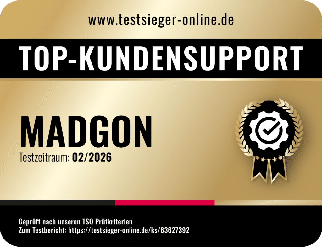 Mehrere Kunden haben den Support von MADGON positiv hervorgehoben. In den Bewertungen wird besonders die schnelle Reaktionszeit sowie die freundliche und lösungsorientierte Kommunikation gelobt. Dies bestätigt unser Testergebnis, dass MADGON mindestens zwei Rezensionen vorweist, in denen der Kundensupport explizit gelobt wird – ein deutlicher Hinweis auf hohe Kundenzufriedenheit.