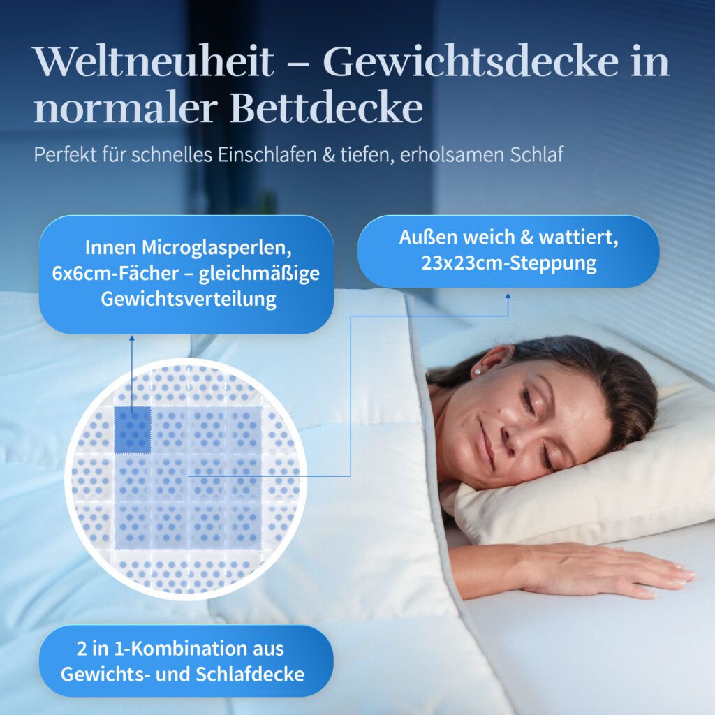 Unsere Hybrid-Decke vereint erstmals die besten Eigenschaften aus zwei Welten: die wohltuende Schwere einer Gewichtsdecke und den Komfort einer klassischen Bettdecke. Während herkömmliche Gewichtsdecken oft als kalt und hart empfunden werden und Bettdecken zwar weich und warm, aber zu leicht sind, kombiniert unsere innovative Konstruktion genau das, was wirklich zählt. Die Decke ist warm, weich, anschmiegsam und gleichzeitig angenehm schwer. Dadurch entsteht ein sanftes Gefühl des Umarmtwerdens, das das Einschlafen erleichtert und durch die Tiefendruckstimulation zu einem besonders ruhigen und tiefen Schlaf beiträgt. Der größte Vorteil zeigt sich am Morgen: Man wacht ausgeruht, entspannt und erfrischt auf und startet mit neuer Energie in den Tag.