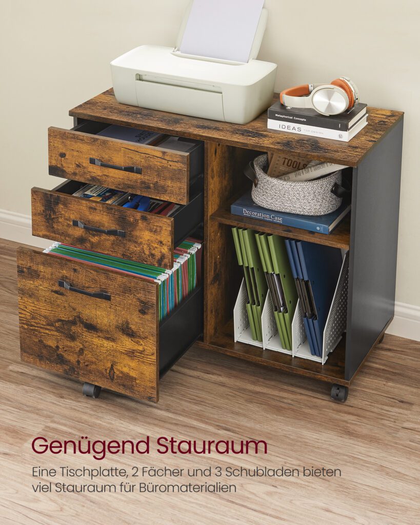 Der Rollcontainer überzeugt mit reichlich Stauraum und einer durchdachten Aufteilung: Eine großzügige Arbeitsfläche von 40 × 80 cm bietet Platz für Ihren Drucker, während zwei offene Fächer Bücher oder Arbeitsmaterialien aufnehmen. Ergänzt wird das Ganze durch drei praktische Schubladen, die genügend Platz für all Ihre Büromaterialien bieten – so bleibt Ihr Arbeitszimmer stets ordentlich und gut organisiert.