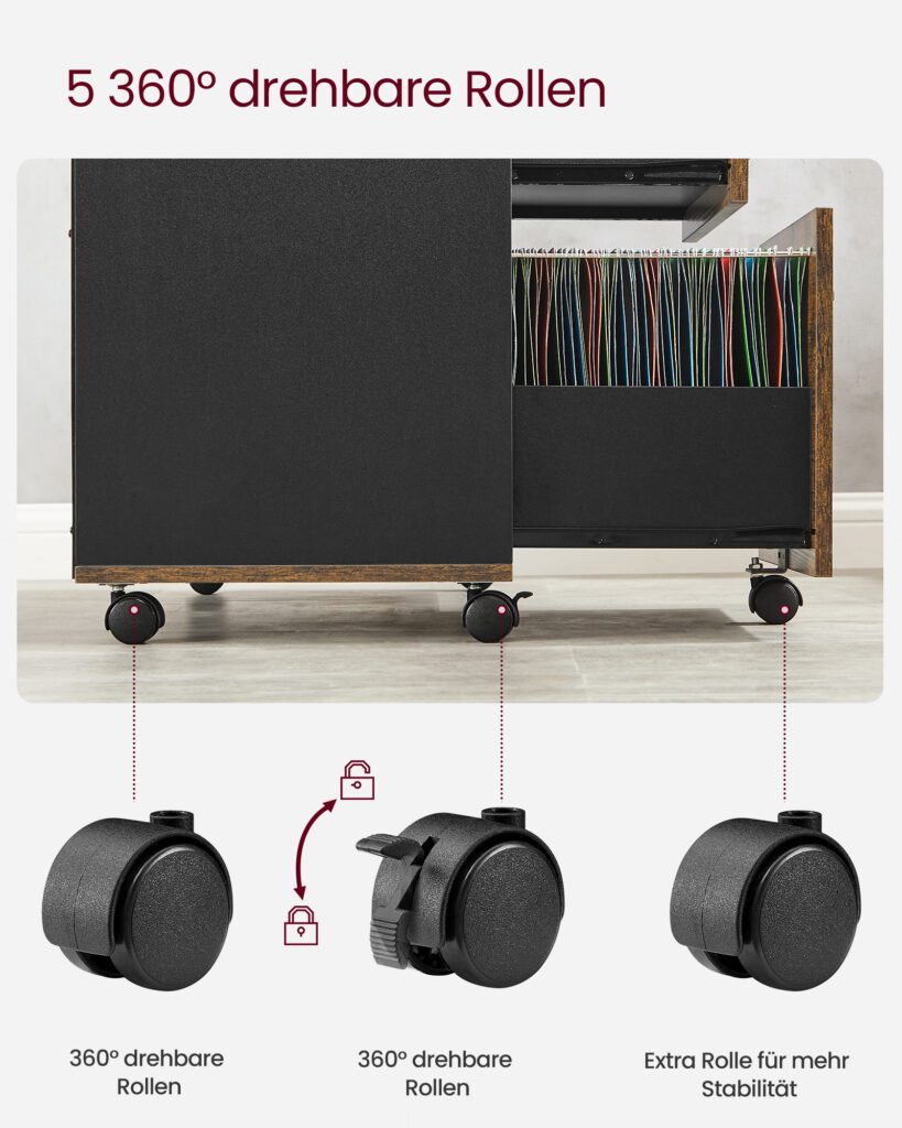 Für maximale Flexibilität ist der Büroschrank mit fünf 360° drehbaren Rollen ausgestattet, von denen zwei arretierbar sind. So bleibt der Schrank bei Bedarf sicher an Ort und Stelle. Die zusätzliche vordere Rolle unter den Schubladen verhindert ein Umkippen und sorgt für extra Stabilität – ideal für den täglichen Einsatz im Büro.