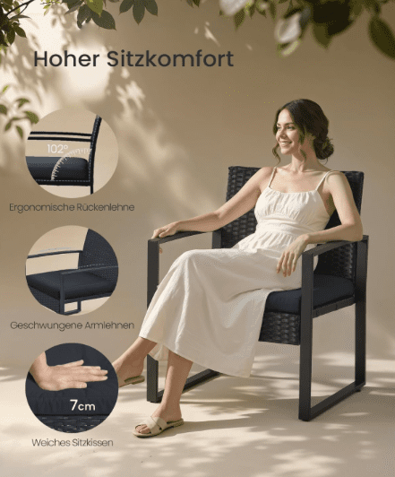 Im Rahmen des Tests der Balkonmöbel der Marke SONGMICS haben wir drei Hauptmerkmale identifiziert, die für Kunden besonders wichtig sein könnten. Erstens ist die Eignung der Möbel für den ganzjährigen Einsatz kennzeichnend. Die langlebigen Materialien – ein verstärkter Stahlrahmen, in Kombination mit hochdichtem PE-Polyrattan – gewährleisten eine hervorragende UV-Beständigkeit und Schutz gegen Feuchtigkeit und Schimmel. Dieses Set ist somit für einen dauerhaften Einsatz im Außenbereich konzipiert und erfordert nur einen minimalen Pflegeaufwand.