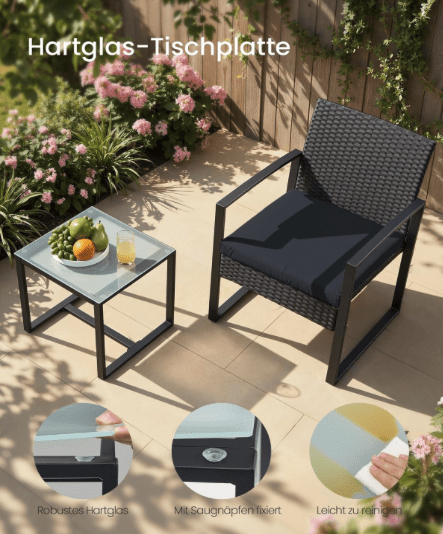 Das Balkonmöbel-Set von SONGMICS erweist sich dank seiner soliden Bauweise als qualitativ hochwertig und langlebig. Die Grundstruktur des Sets bildet ein stabiler Metallrahmen. Dieser bietet eine hohe Tragfähigkeit, auf dem sowohl die bequem gepolsterten PE-Polyrattan-Stühle als auch der Tisch mit seiner Hartglasplatte sicher ruhen. Dieser Materialmix sorgt nicht nur für angenehmen Sitzkomfort, sondern auch für eine stabile Ablage, die jeder Belastung standhält.