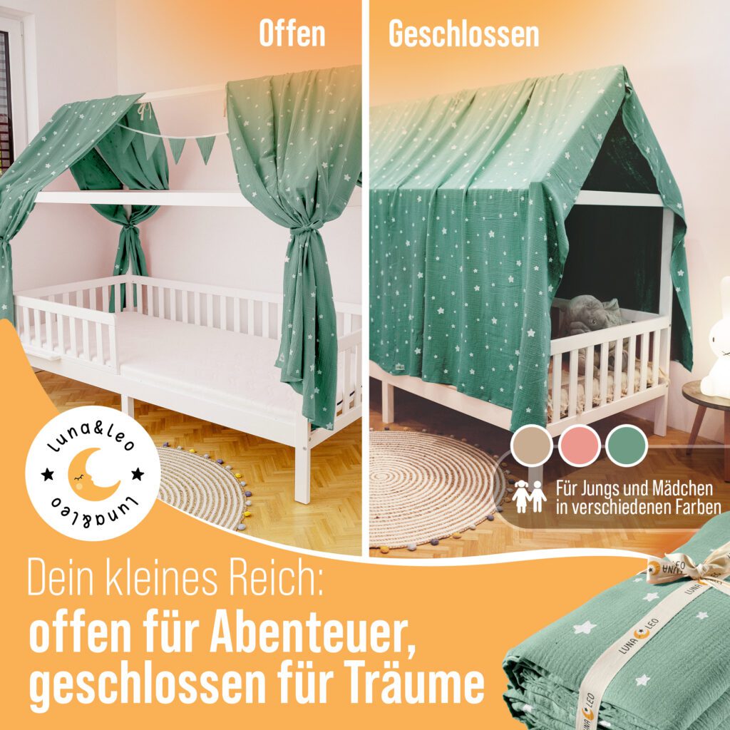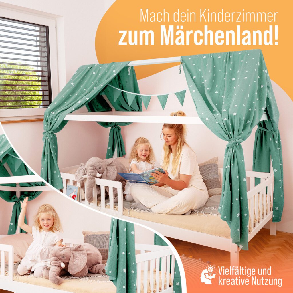 Der größte Vorteil liegt darin, dass das Set einen gemütlichen Rückzugsort für das Kind schafft. Nach einem hektischen Tag kann sich das Kind hier entspannen, fühlt sich wohler und findet leichter in den Schlaf – ein Beitrag zu mehr Ausgeglichenheit und Wohlbefinden. Gleichzeitig dient der Betthimmel als stilvoller Eyecatcher, der das Kinderzimmer optisch aufwertet. Dank der flexiblen Befestigung an den Bettpfosten lässt sich der Himmel zudem bei Bedarf von einem Rückzugsort in ein dekoratives Highlight verwandeln.