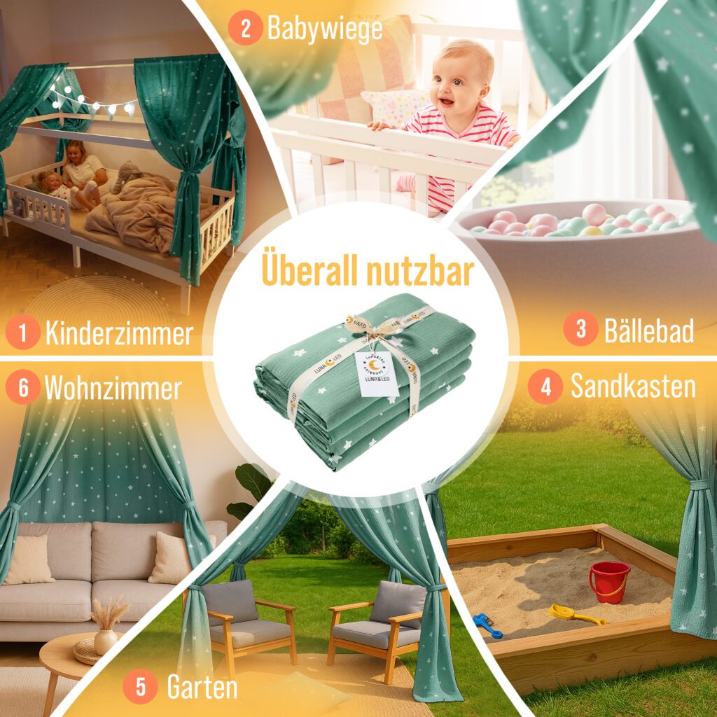 Doch dieser Sternenhimmel ist weit mehr als nur ein Deko-Objekt. Durch die extra-breiten Stoffbahnen mit einer Breite von etwa 130 cm lässt er sich in wenigen Sekunden in eine Ruhehöhle für das Kind verwandeln. In der heutigen Zeit, in der viele Familien in kleinen Wohnungen leben oder einen hektischen Alltag haben, ist ein solcher Rückzugsort für das Kind enorm wichtig. Studien zeigen, dass dieser die Entwicklung des Kindes stark fördert und es dabei unterstützt, nach einem anstrengenden Tag zur Ruhe zu kommen.