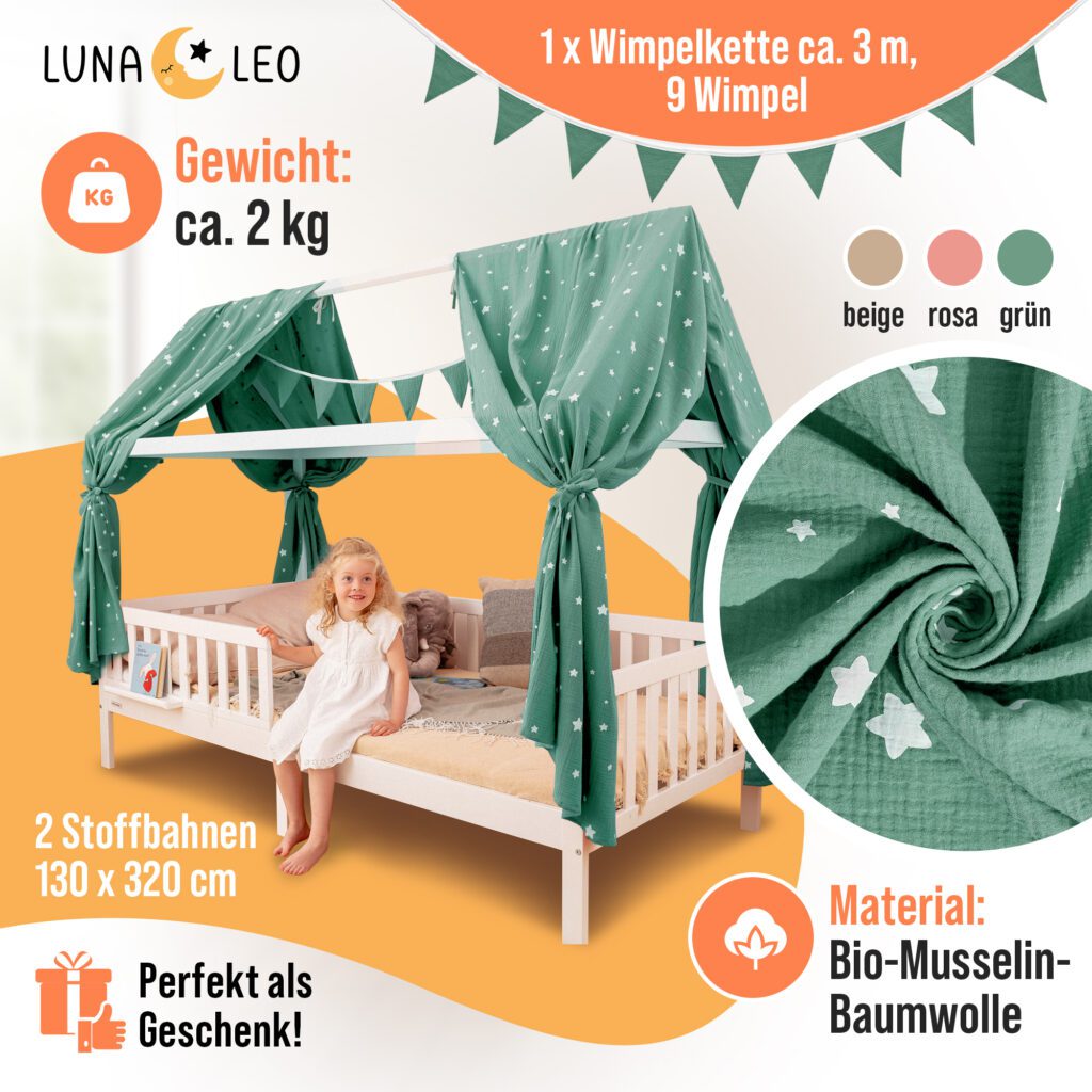 Das Produkt dient als stilvolle Ergänzung zu einem Hausbett. Der Betthimmel wird einfach mit Stoffschlaufen am Hausbett befestigt und verwandelt den Schlafbereich in einen gemütlichen Rückzugsort für das Kind. Die Wimpelkette lässt sich wahlweise am Bett oder an der Zimmerwand anbringen und sorgt für eine noch wohnlichere, fröhliche Atmosphäre, die das Kinderzimmer liebevoll abrundet.