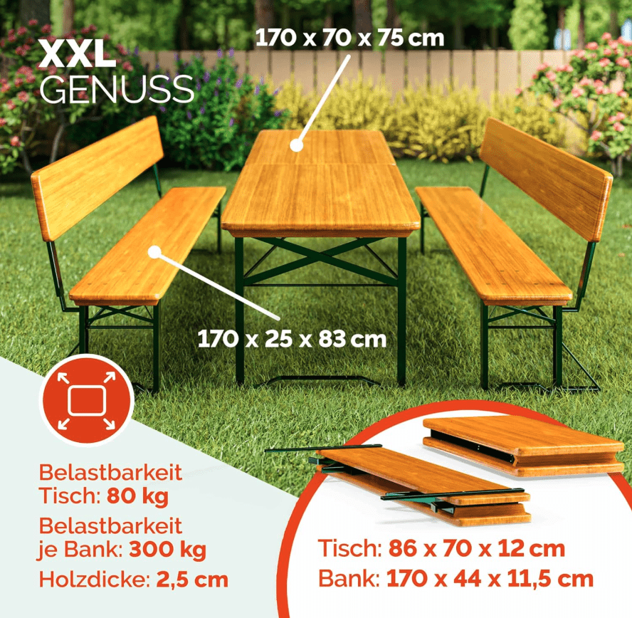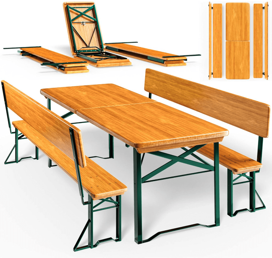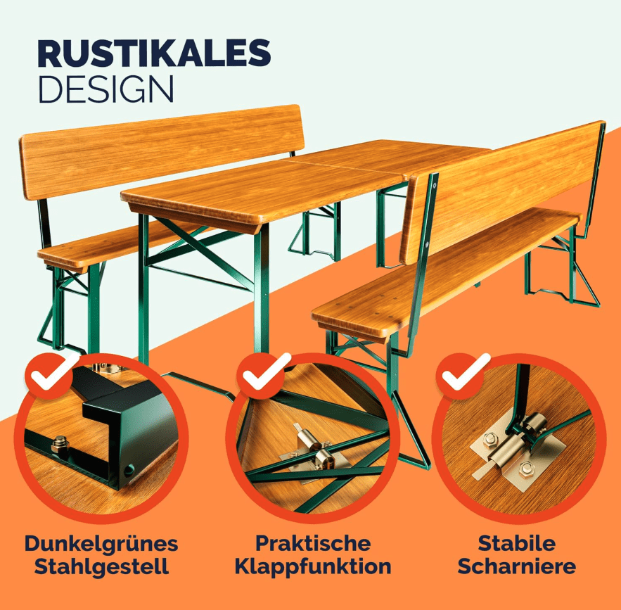Der größte Vorteil für die Kunden ist jedoch die Benutzerfreundlichkeit der Bierzeltgarnitur. Sie lässt sich kinderleicht und schnell auf- und wieder abbauen. Dies liegt an den klappbaren Füßen und dem in der Mitte klappbaren Biertisch. Diese Eigenschaften machen sie perfekt zum Transport oder zum Verstauen bei Nichtgebrauch. Sie können die Bierzeltgarnitur ohne Probleme von Ort zu Ort transportieren und sie bei Bedarf leicht verstauen.