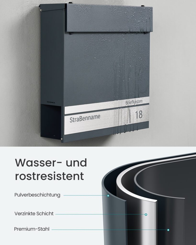 Der Briefkasten der Marke SONGMICS zeichnet sich vor allem durch seine Langlebigkeit aus. Hergestellt aus verzinktem Stahl mit einer pulverbeschichteten Oberfläche ist er wasserfest und rostbeständig, was eine lange Lebensdauer verspricht.