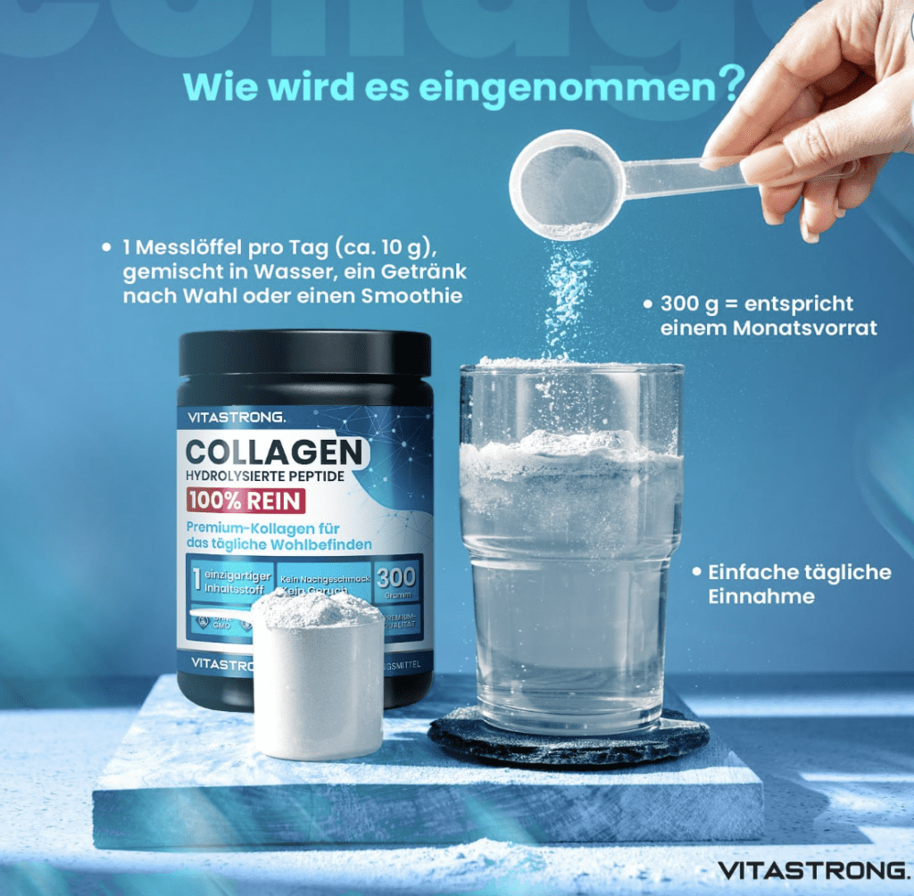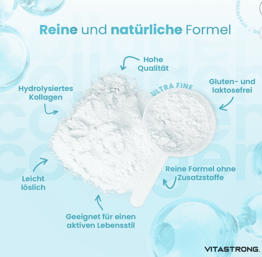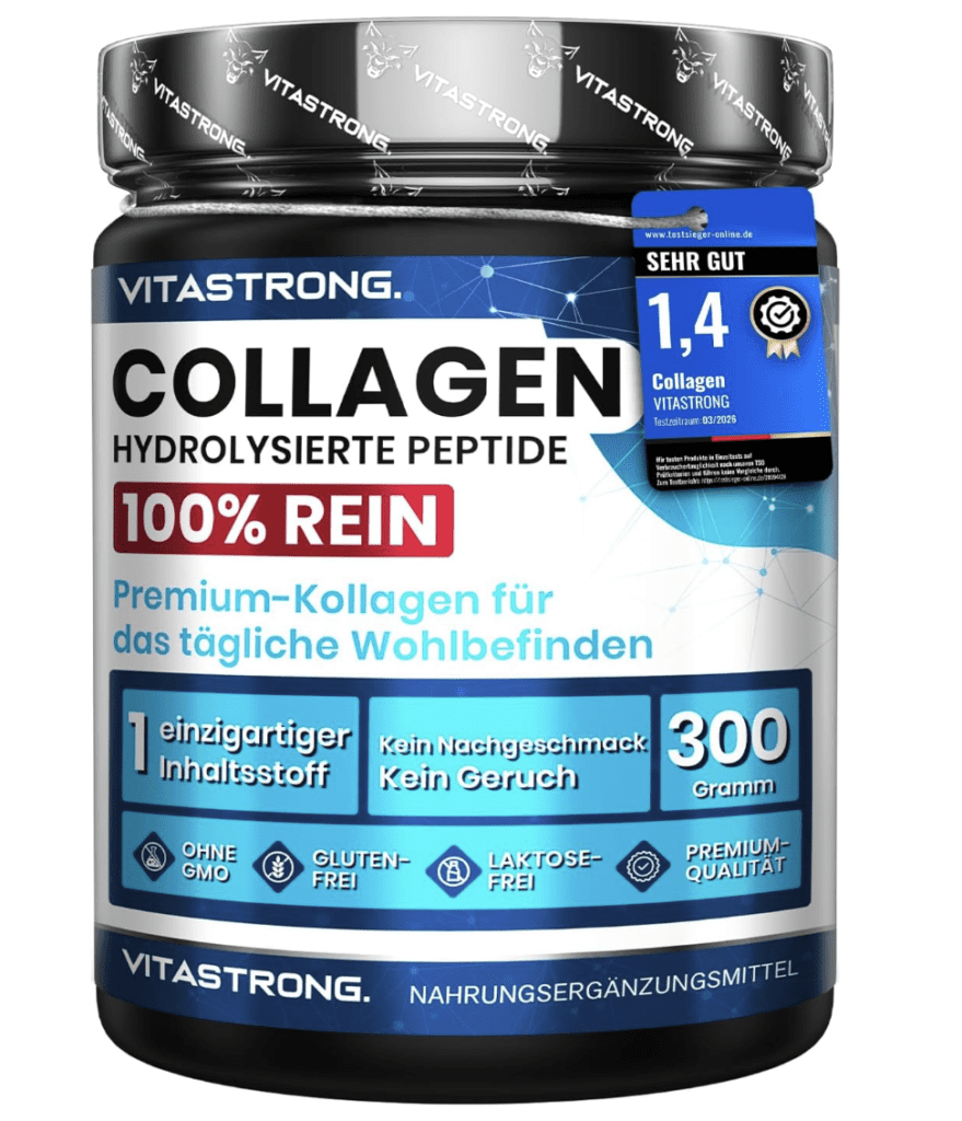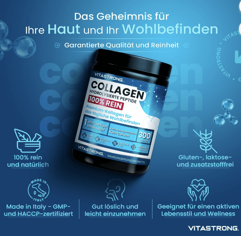 Collagen ist ein essenzielles Protein, das in unserem Körper eine Schlüsselfunktion einnimmt – es ist maßgeblich für die Gesundheit und Struktur unserer Haut, Haare, Nägel, Gelenke, Muskeln und vieles mehr. Seine regelmäßige Zufuhr durch Nahrungsergänzungsmittel wie das Collagen der Marke VITASTRONG kann bei der Verbesserung der Hautstruktur, der Stärkung der Gelenke und Muskeln sowie bei der Förderung von Haar- und Nagelwachstum hilfreich sein.