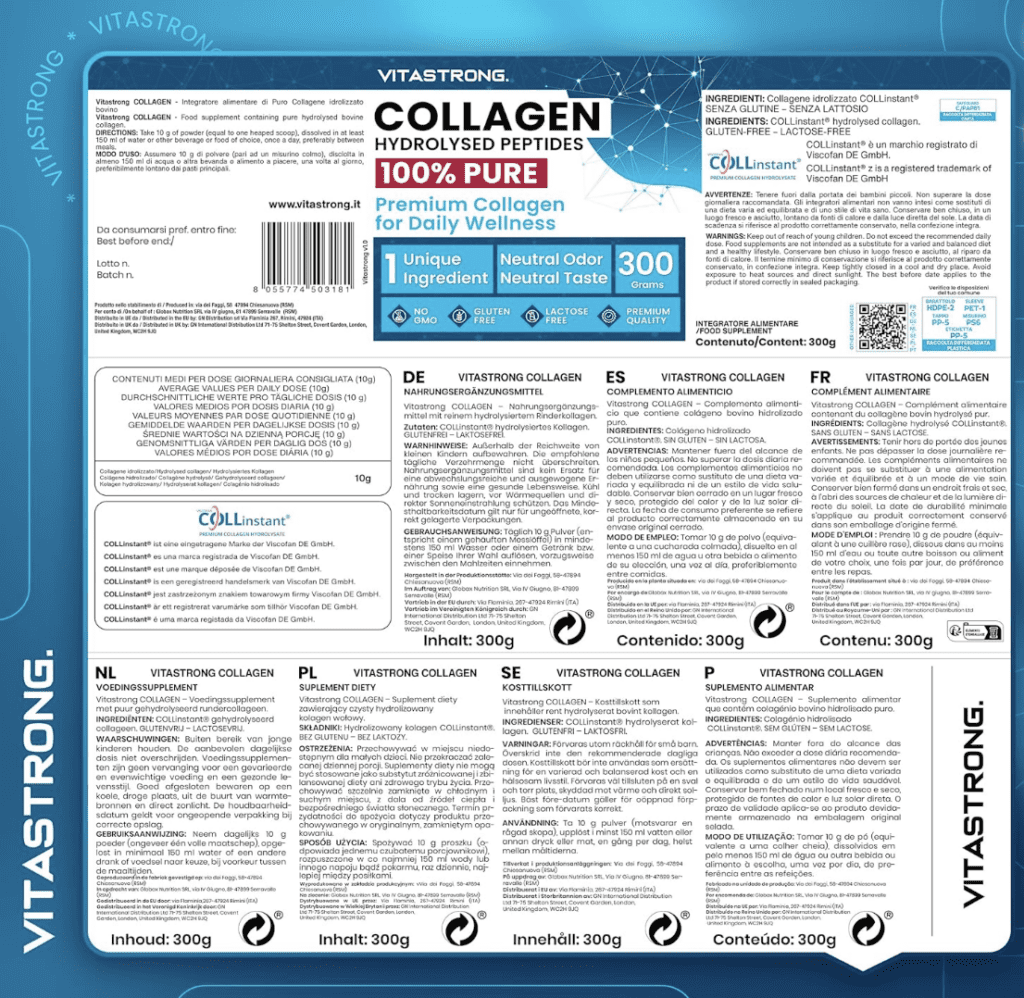 Das Collagen von VITASTRONG ist glutenfrei, laktosefrei und ohne Gentechnik, was es zu einer guten Wahl für Personen mit bestimmten diätetischen Einschränkungen oder Vorlieben macht. Es enthält außerdem COLLinstant®-zertifiziertes Kollagen, ein Qualitätsmerkmal, das dessen Reinheit und Wirksamkeit bestätigt.