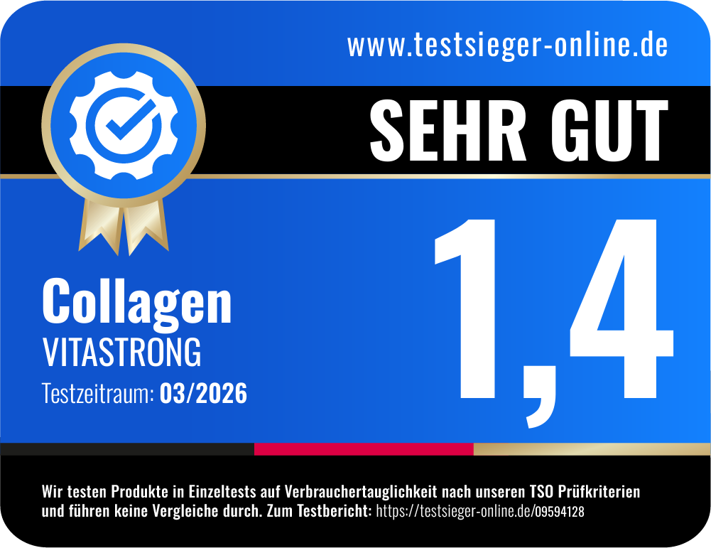 Mit der Ausnahme der fehlenden Kontaktmöglichkeit zum Hersteller, sind wir insgesamt sehr mit dem Collagen von VITASTRONG zufrieden und können es aufgrund unserer Testergebnisse weiterempfehlen.