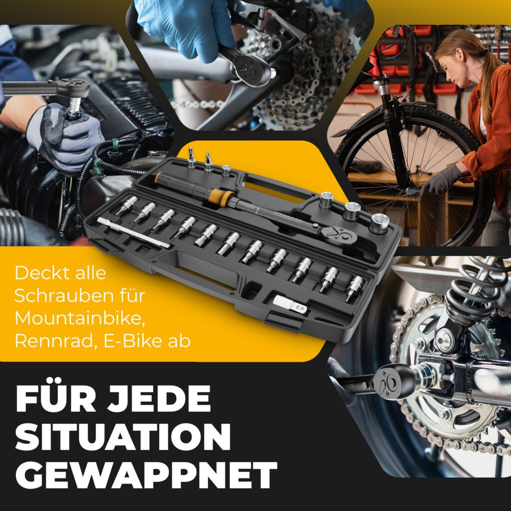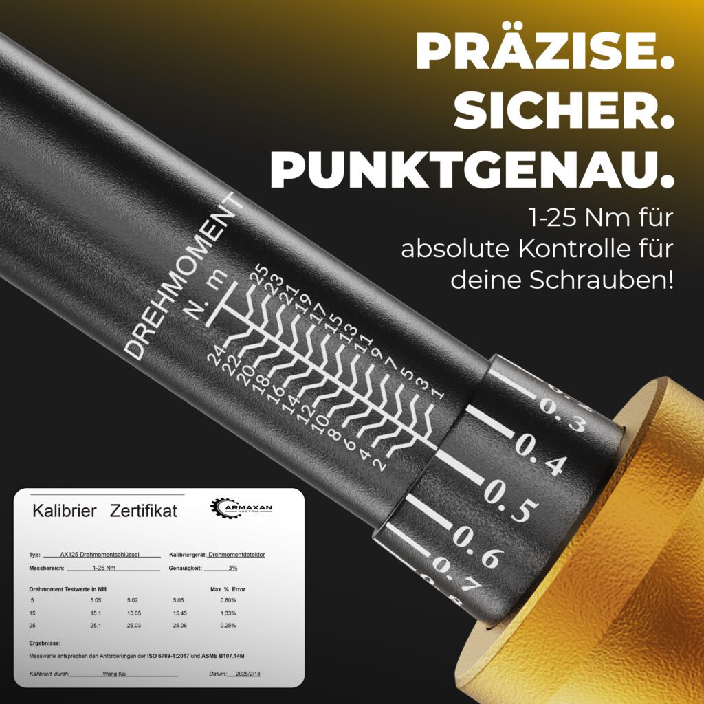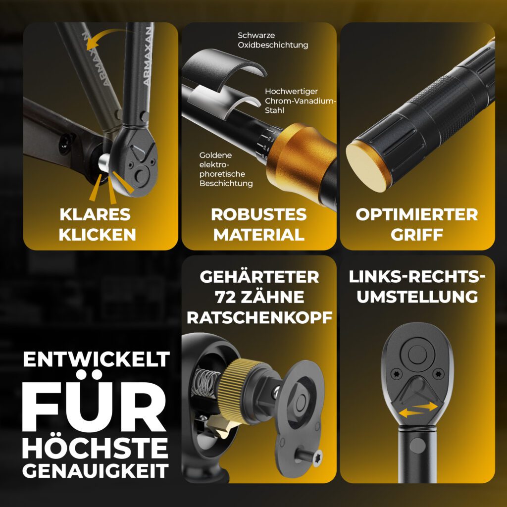 Der größte Vorteil des ARMAXAN Drehmomentschlüssels liegt in seiner zuverlässigen und reproduzierbaren Präzision beim Schraubenanzug. Mit diesem Werkzeug lassen sich teure Komponenten effektiv vor Schäden schützen, die Lebensdauer von Bauteilen verlängern und Montagefehler deutlich reduzieren. Gleichzeitig gewährleistet es eine sichere und korrekte Kraftübertragung. Durch die klar ablesbare Drehmoment-Einstellung und das eindeutige Klick-Signal kann selbst ein ungeübter Nutzer Schrauben präzise anziehen. Das Ergebnis ist mehr Sicherheit, weniger Materialverschleiß und eine professionelle, fehlerfreie Montage – ideal für Arbeiten an Fahrrädern, Motorrädern, E-Bikes oder empfindlichen Bauteilen.