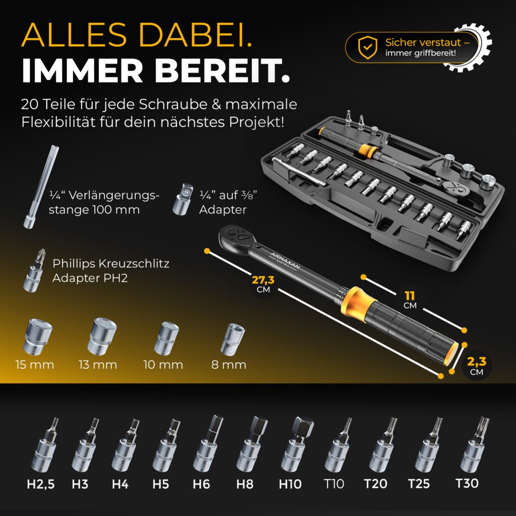 Der Lieferumfang des ARMAXAN Drehmomentschlüssels lässt keine Wünsche offen und bietet alles, was für präzises Arbeiten nötig ist. Enthalten ist der Drehmomentschlüssel selbst mit einem Einstellbereich von 1–25 Nm und einem ¼-Zoll-Antrieb. Für schwer erreichbare Stellen liegt eine 100 mm lange Verlängerungsstange bei. Ergänzt wird das Set durch sieben HEX-Bits in den Größen 2,5, 3, 4, 5, 6, 8 und 10 mm sowie fünf Torx-Bits (T10, T15, T20, T25 und T30). Ein ¼-Zoll-auf-¾-Zoll-Adapter, ein Kreuzschlitz-Bit Philips PH2 und vier zusätzliche Innensechskant-Bits in den Größen 8, 10, 13 und 15 runden das Set ab. Zusätzlich enthält das Paket ein Kalibrierzertifikat für höchste Präzision und einen kompakten, stoßfesten Aufbewahrungskoffer, der Ordnung und Sicherheit beim Transport garantiert.