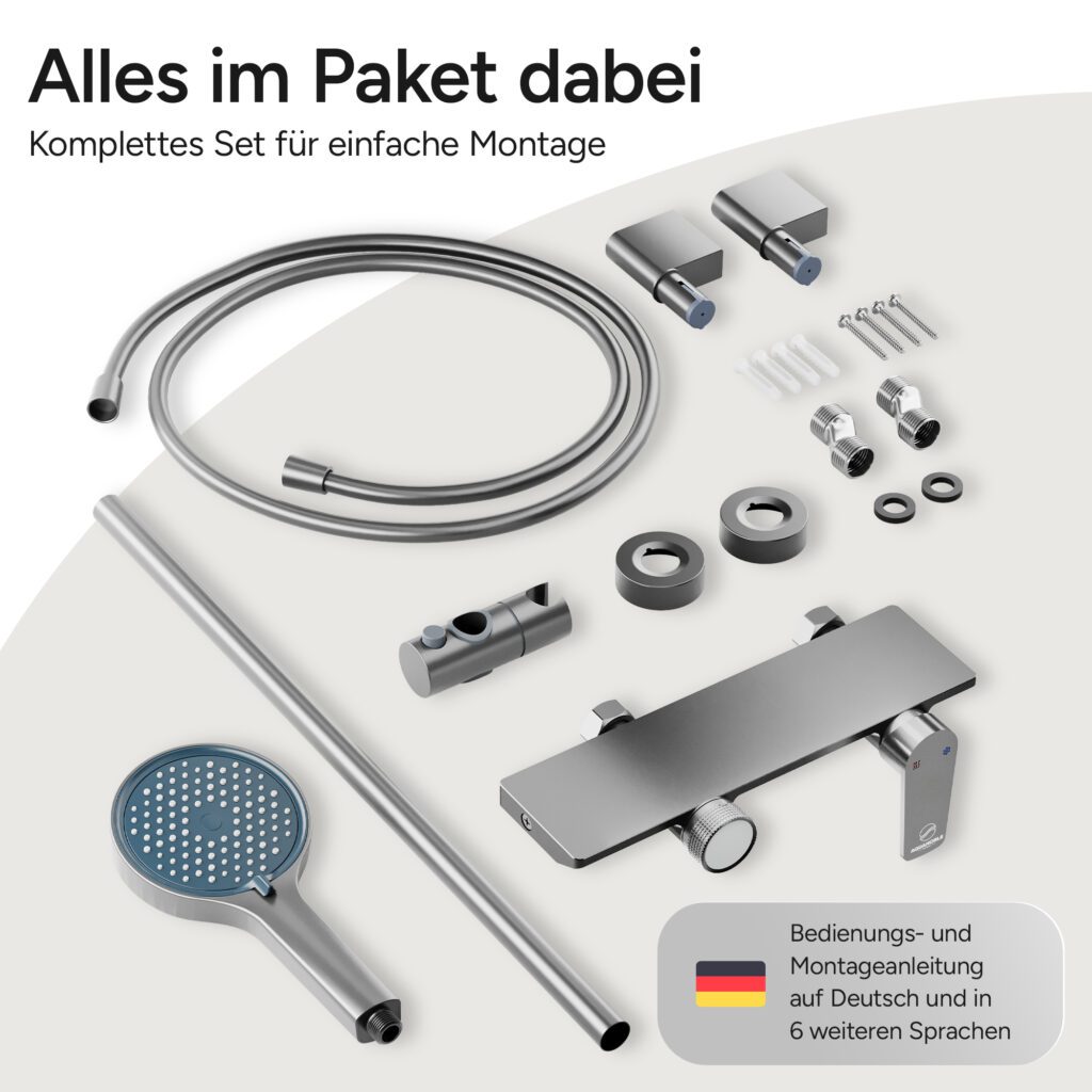 Erfreulich zu erwähnen ist zudem die beigelegte Bedienungsanleitung. Sie ist verständlich verfasst und bietet detaillierte Anleitungen zur Montage und Bedienung des Duschsystems. Ein Punkt, der insbesondere weniger technisch versierte Käufer zu schätzen wissen werden.