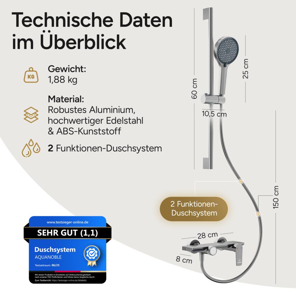 Das Duschsystem der Marke AQUANOBLE, das wir momentan intensiv testen, wird aktuell für 149,00€ auf dem Markt angeboten. Der Preis dieses Models beträgt somit weniger im Vergleich zu ähnlichen Produkten auf dem Markt, was es zu einer besonders attraktiven Option für preissensitive Verbraucher macht.