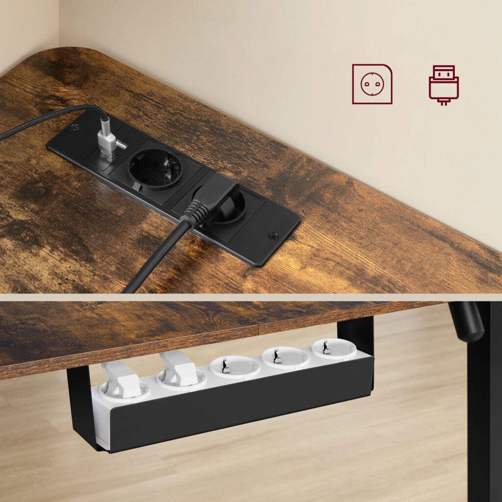 Für ein aufgeräumtes Arbeitsumfeld empfiehlt sich ein durchdachtes Kabelmanagement: Die Steckdosenleiste kann auf der vorgesehenen Ablage unter der Tischplatte platziert werden, sodass Kabel beim Hoch- und Herunterfahren sauber geführt werden und nicht stören. Häufig genutzte Elektrogeräte wie Laptop, Smartphone oder Tablet lassen sich besonders praktisch über die integrierte Ladestation in der Tischplatte mit Strom versorgen – jederzeit griffbereit und flexibel einsetzbar.