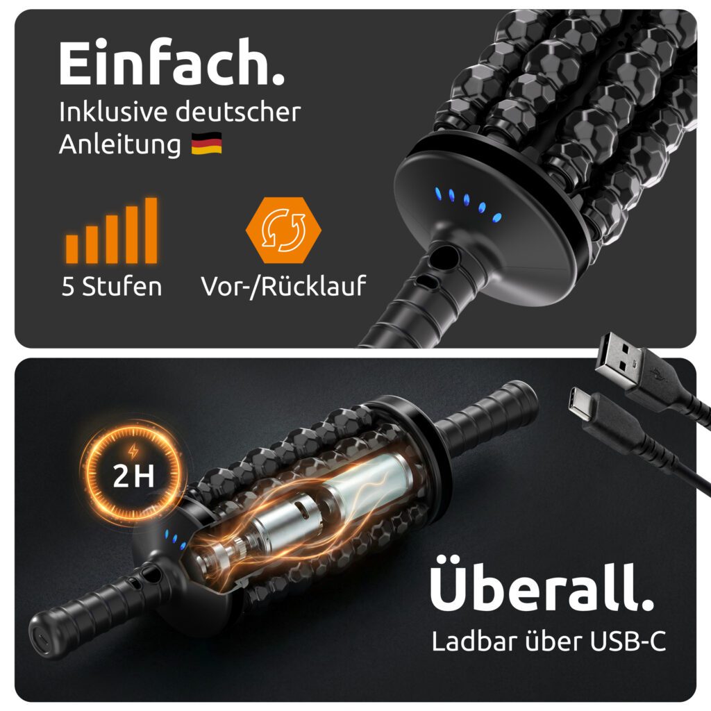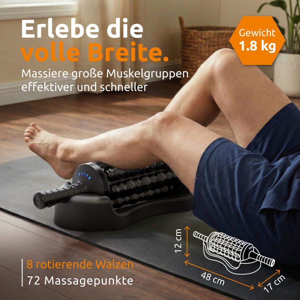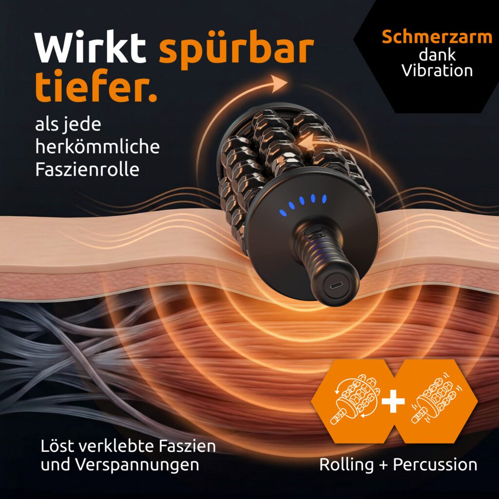 Der größte Vorteil, den Kunden genießen, ist eine spürbare Muskel- und Faszienlockerung mit deutlich weniger Aufwand, verglichen mit klassischen Faszienrollen. Statt sich auf dem Boden mit dem Körpergewicht abzurollen, drehen die Walzen motorisiert – der Nutzer muss das Gerät nur führen. Dies ermöglicht eine einfacher und kontrollierter Anwendung, die auch im Sitzen oder im Stehen ausgeführt werden kann. Das Ergebnis ist eine schnelle, gleichmäßige Stimulation großer Muskelgruppen und ein spürbares Gefühl von mehr Beweglichkeit und „Leichtigkeit“ nach kurzen Sessions.