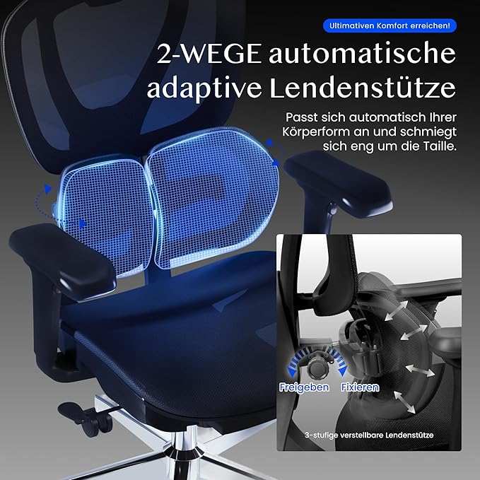 Die erste ist die innovative Dual-Wing-Lendenstütze mit Mehrfachverstellung. Diese beidseitige Lendenstütze passt sich individual an den unteren Rücken des Benutzers an und stabilisiert dabei die natürliche C-Form der Wirbelsäule. Dies sorgt für gezielte Entlastung und ist ein entscheidender Vorteil, besonders bei langem Sitzen.