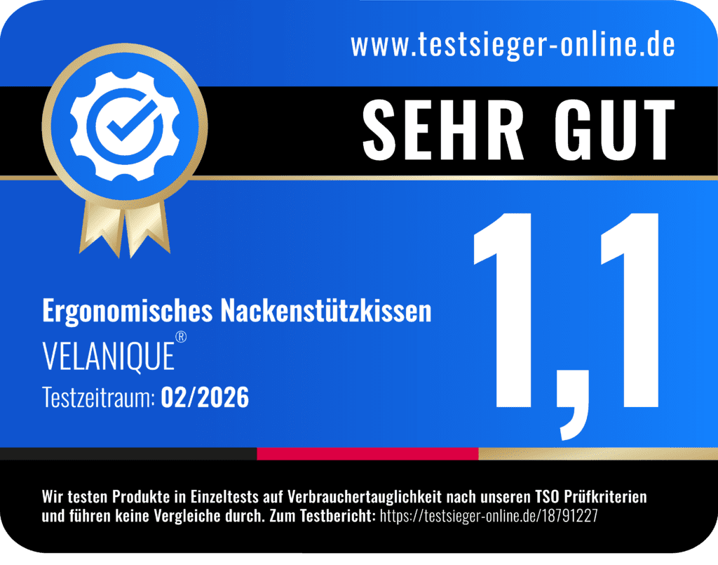 Nach intensiver Prüfung kann das ergonomische Nackenstützkissen der Marke VELANIQUE® durch seine Qualität und die durchdachte Gestaltung bestechen.