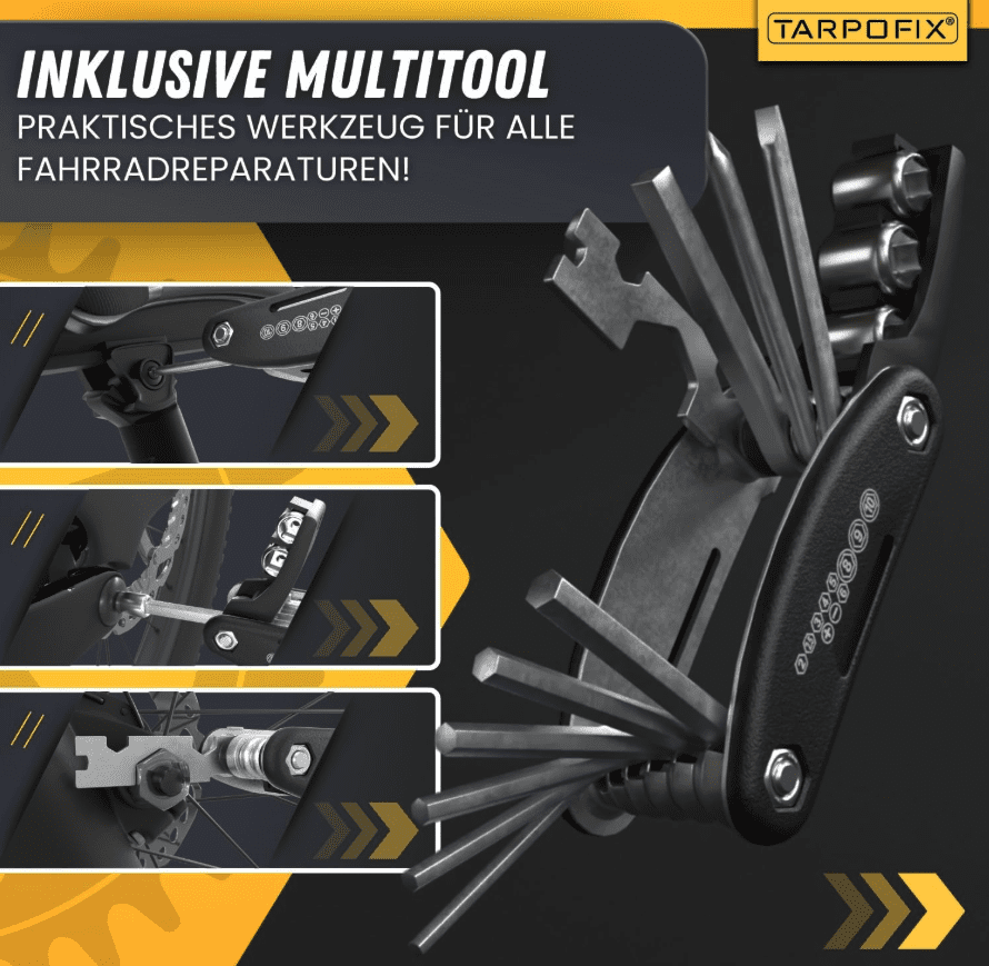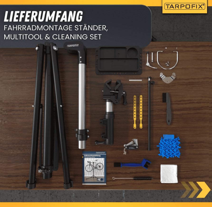 Die Marke Tarpofix überzeugt mit ihrem Fahrradmontageständer durch Qualität, Funktionalität und durchdachte Ausstattung. Bereits beim Auspacken hinterlässt das Produkt einen sehr guten Eindruck: Verpackung und Ständer kommen unbeschädigt an, der Lieferumfang ist vollständig und praxisgerecht. Neben dem stabilen Montageständer und der magnetischen Werkzeugablage enthält das Set exklusives Zubehör, das sofort einsatzbereit ist. Ein vielseitiges Multitool vereint die wichtigsten Werkzeuge für gängige Reparaturen, während das 5-teilige Reinigungsset – bestehend aus Universallappen, Reinigungspad, Lückenbürste, Kettenbürste und Eckbürste – das Fahrrad nach Wartung oder Reparatur auch optisch wieder in Hochglanz erstrahlen lässt. Insgesamt bietet Tarpofix mit diesem Set ein rundum durchdachtes Paket für alle Fahrradliebhaber, die Wert auf Komfort, Stabilität und einfache Handhabung legen.