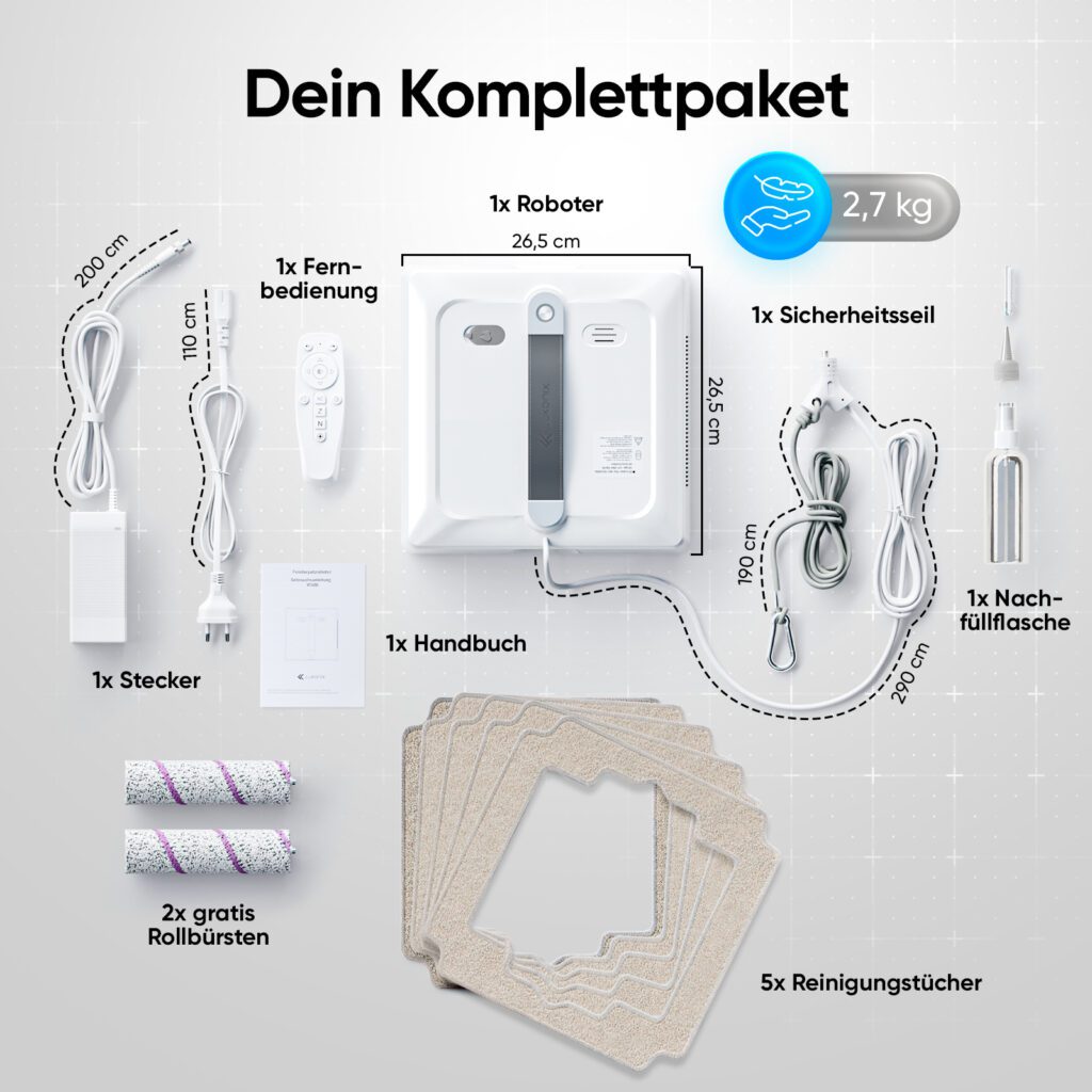Der Lieferumfang ist sehr großzügig, was besonders positiv auffällt. Neben dem Fensterroboter W50D selbst beinhaltet diese das notwendige Zubehör wie einen Adapter, ein Sicherheitsseil und eine Fernbedienung. Auch die umfangreiche Bedienungsanleitung ist klar strukturiert und leicht verständlich, was für einen problemlosen Einstieg in die Bedienung des Gerätes sorgt.