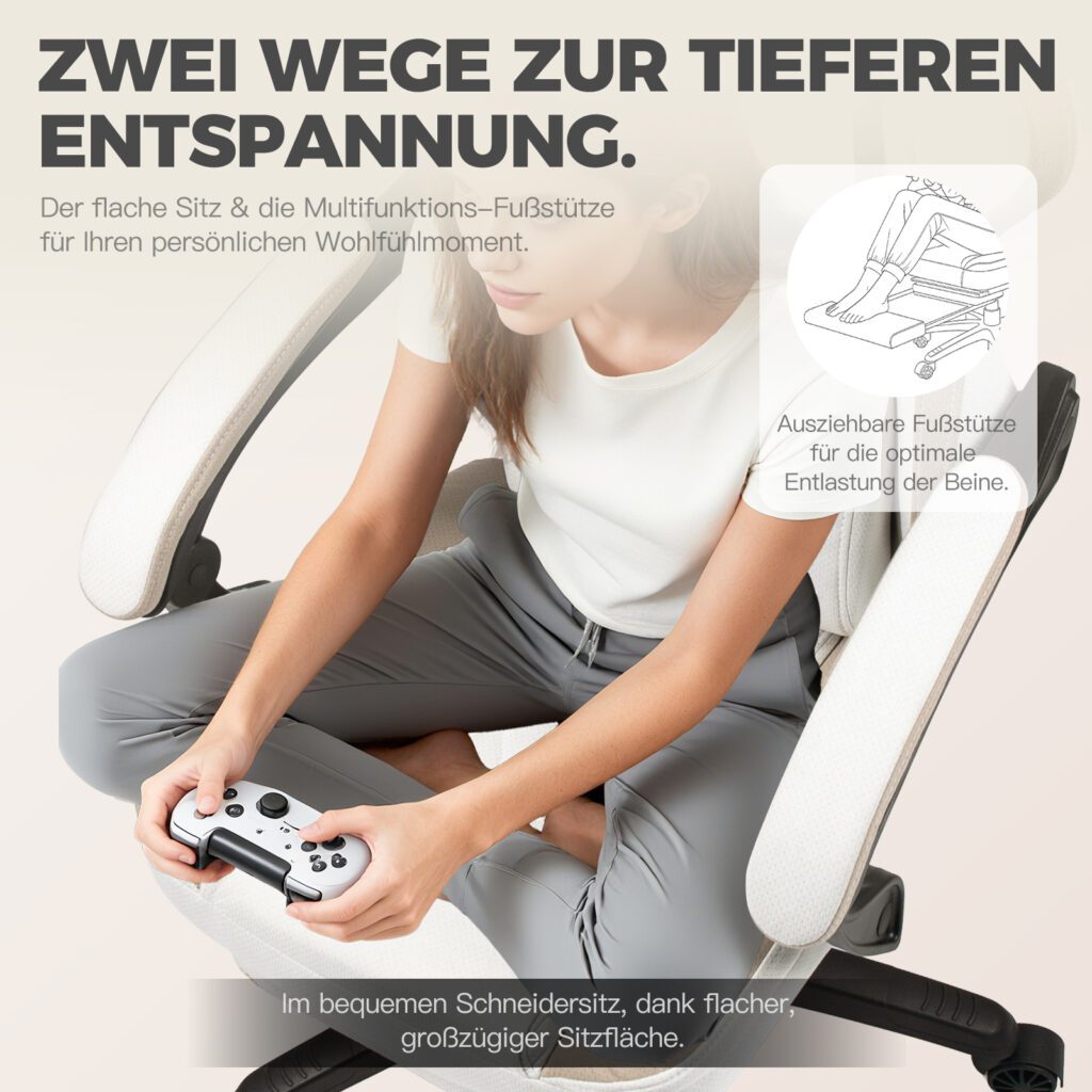 Der größte Vorteil für den Kunden ist eine deutlich gesteigerte Sitzkomfortabilität und eine effektive Verringerung von Ermüdungserscheinungen bei langem Sitzen. Das einzigartige Federkern-Sitzpaket zusammen mit dem abnehmbaren Gel-Kissen bietet herausragenden Komfort und Atmungsaktivität. Die verstellbare Lordosenstütze mit Vibrationsmassage zielt spezifisch auf die Entlastung des unteren Rückens ab und fördert die Durchblutung. Das offene Sitzdesign ohne Seitenwangen und der große Verstellbereich stellen sicher, dass Nutzer aller Körpergrößen ihre optimale, entspannte Position finden können, um sich vollständig auf die Arbeit oder das Spiel zu konzentrieren.