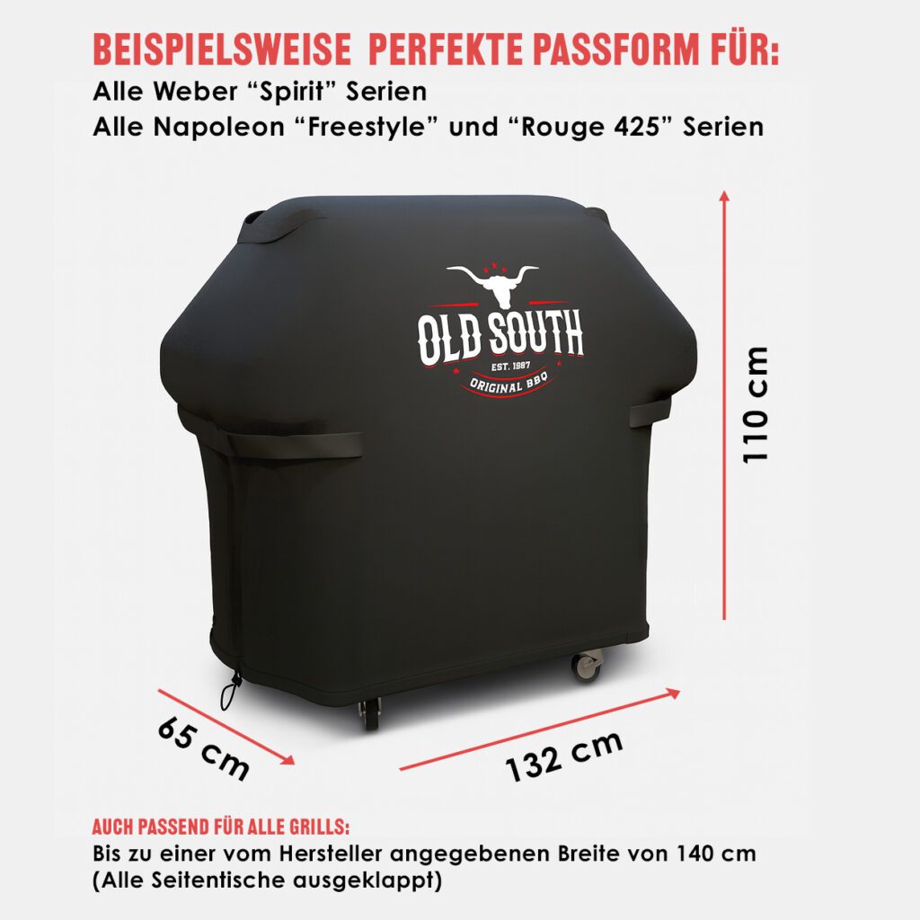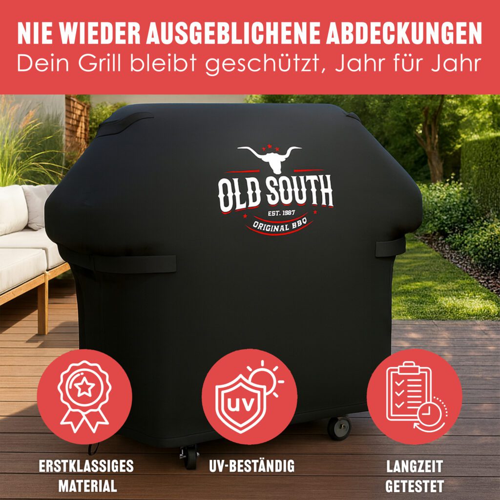 Die Grillabdeckung der Marke Old South wurde speziell zum Schutz eines Gasgrills entwickelt. Nachdem der Grillgebrauch beendet und der Grill wieder auf eine angemessene Temperatur abgekühlt ist, kann die Abdeckung einfach über den Gasgrill gezogen werden. Das Ausrichten und Überziehen der Grillabdeckung wird durch die praktischen Griffe zu einem kinderleichten Prozess.