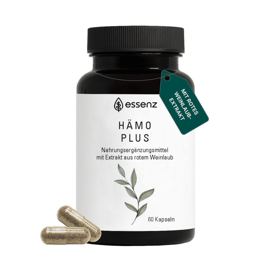 Die ESSENZ Hämo Plus Kapseln versorgen den Körper gezielt mit einer Kombination sorgfältig ausgewählter Pflanzenextrakte, darunter rotes Weinlaub, Tigerkraut, Steinklee, Hamamelis, Rutin und Traubenkern-Extrakt. Diese Inhaltsstoffe tragen dazu bei, die Gesundheit der Blutgefäße zu unterstützen, die natürliche Mikrozirkulation zu fördern und das allgemeine Wohlbefinden zu stärken. Die Kapseln werden täglich eingenommen und helfen dabei, das körperliche Gleichgewicht zu erhalten sowie die Vitalität und das Wohlbefinden im Alltag nachhaltig zu fördern.