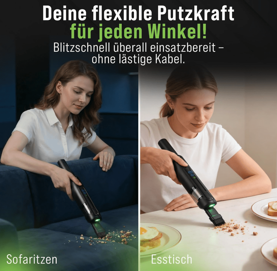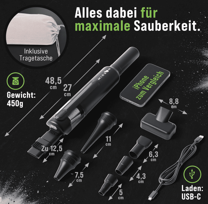 Besonders praktisch ist die vielseitige Anwendbarkeit des Geräts. Dank der mitgelieferten Aufsätze kann der Handstaubsauger nicht nur saugen, sondern auch aufpumpen, absaugen oder als Blasfunktion eingesetzt werden. Dadurch eignet er sich flexibel für unterschiedliche Aufgaben im Auto, Haushalt oder unterwegs.