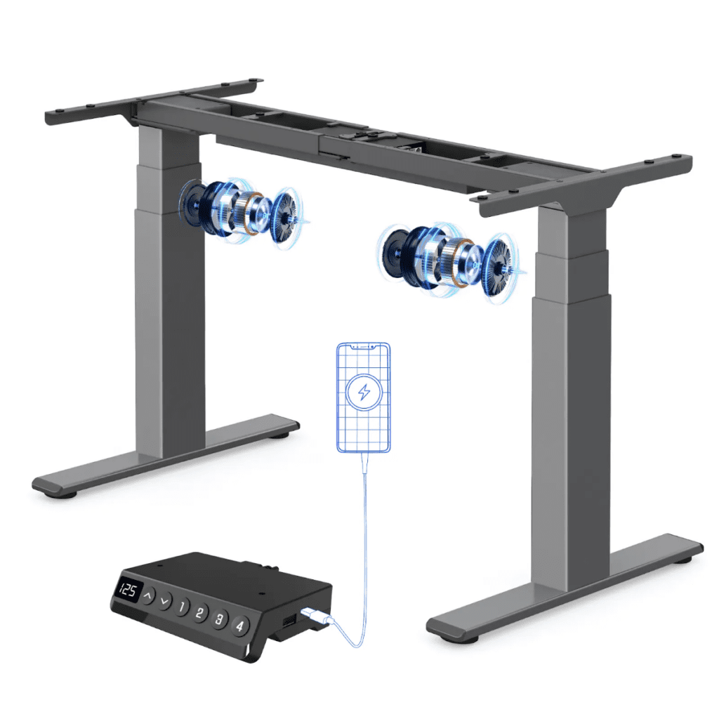 Zweitens überzeugt das leistungsstarke Dual-Motor-System in Kombination mit einer 3-stufigen Säule durch Kraft, Laufruhe und Stabilität. Dank dieses Systems ermöglicht der Tisch eine schnelle und gleichmäßige Höhenverstellung von bis zu 40 mm pro Sekunde. Die höhenverstellbaren, 3-stufigen Teleskop-Beine bieten einen Verstellbereich von 650 mm (zwischen 600–1250 mm), was den Tisch ideal für unterschiedliche Körpergrößen und Arbeitspositionen macht. Dies beseitigt das Problem vieler instabiler oder ruckelnder Einmotor-Systeme.