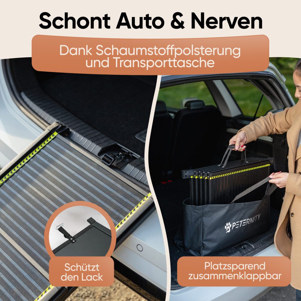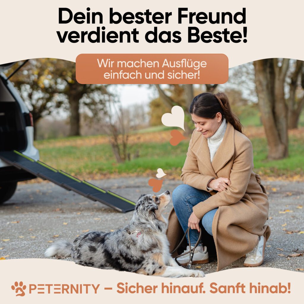 Der größte Vorteil der Peternity Hunderampe für die Kunden liegt in dem Schutz der Gesundheit für den Hund. Sie verhindert unnötige Sprungbelastungen und entlastet gleichzeitig den Hundehalter, da kein schweres Heben mehr erforderlich ist.