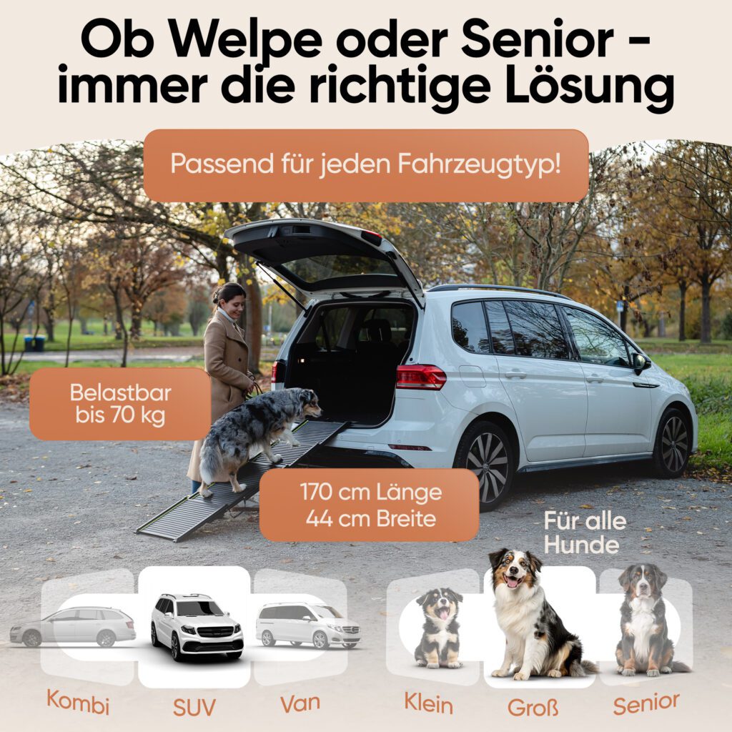 Die Teleskophunderampe aus robustem Aluminium mit rutschfester Gummitrittfläche ermöglicht deinem Hund – ob groß oder klein, jung oder alt, krank oder frisch operiert – ein sicheres und gelenkschonendes Ein- und Aussteigen ins Auto.