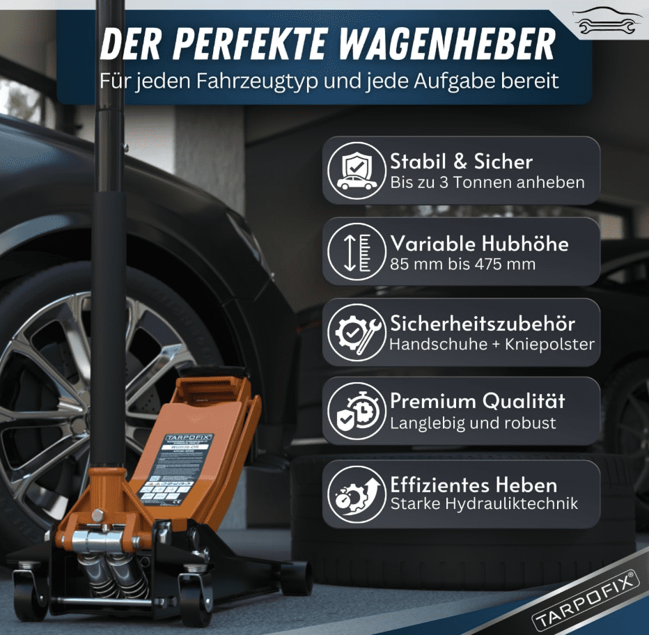 Doch was ist nun der größte Vorteil für die Kunden? Der entscheidende Vorteil dieses Wagenhebers ist die Kombination aus enormer Kraft und flexibler Einsatzbreite: Mit einer Tragkraft von bis zu 3 Tonnen und einer extrem niedrigen Unterfahrhöhe von nur 85 mm eignet er sich sowohl für schwere SUVs als auch für tiefgelegte Sportwagen. Der Nutzer erreicht dadurch maximale Unabhängigkeit, da er mit nur einem Werkzeug fast jeden Pkw-Typ sicher anheben kann. Zudem sorgen integrierte Schutzelemente wie Gummiauflagen und schaumstoffummantelte Hebelstangen dafür, dass das Fahrzeug beim Anheben vor Kratzern und Dellen geschützt bleibt, was den Werterhalt des Autos sichert. Zusätzlich sind im Set noch praktische Zusatzprodukte wie ein Reifenprofilmesser, eine Knieschutzmatte und Handschuhe enthalten.