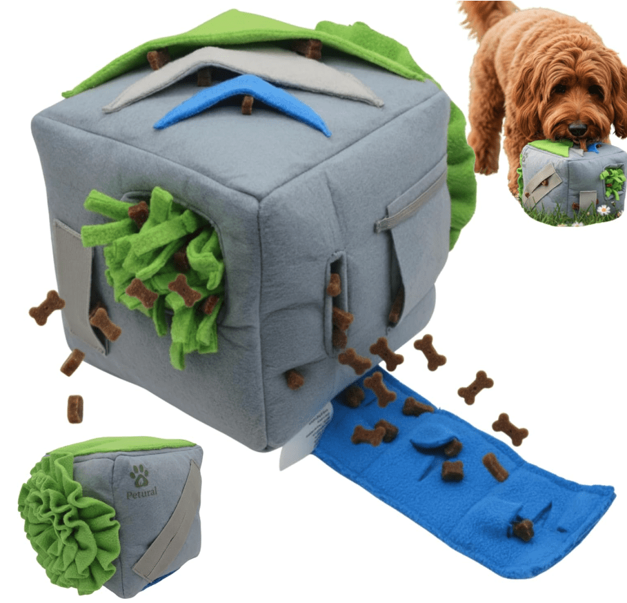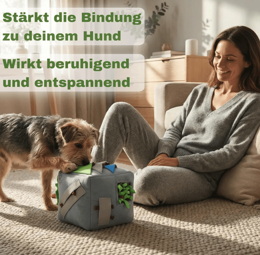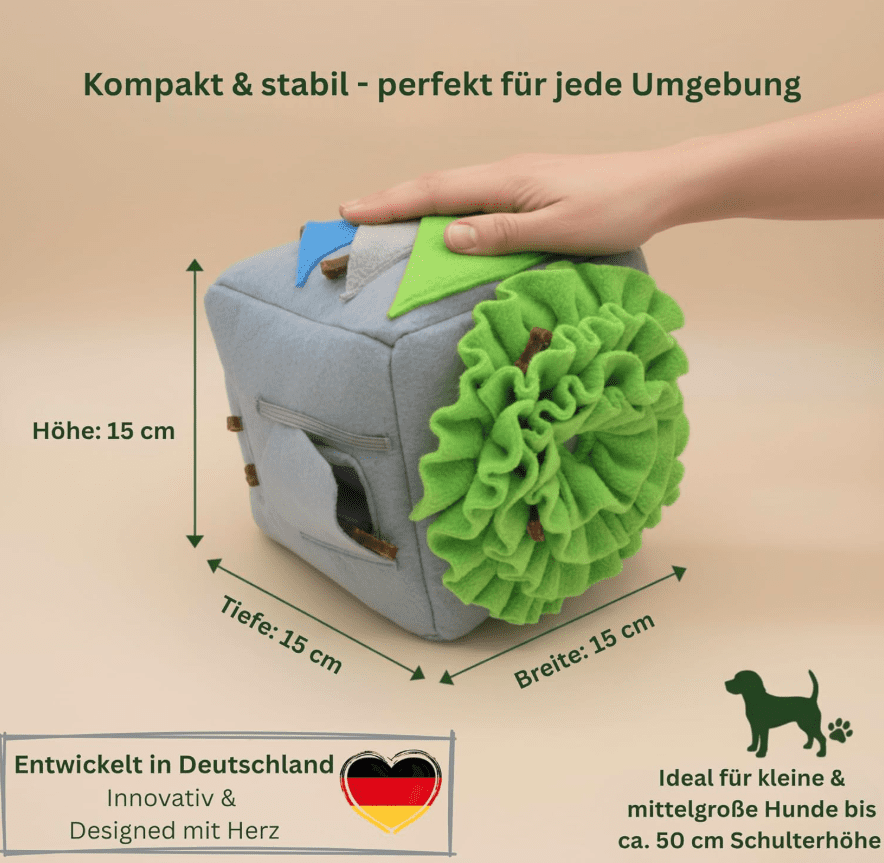Dadurch entsteht nicht nur reine Nasenarbeit, sondern eine spannende Kombination aus Geruchssinn, Problemlösungsfähigkeit, Koordination von Pfoten und Schnauze sowie körperlicher Bewegung. Im Gegensatz zu klassischen Schnüffelteppichen, die möglichst rutschfest sein sollen, ist die Bewegung des Würfels ausdrücklich gewollt – das aktive Drehen und Verschieben im Raum erhöht die Herausforderung und sorgt für eine intensivere Beschäftigung.