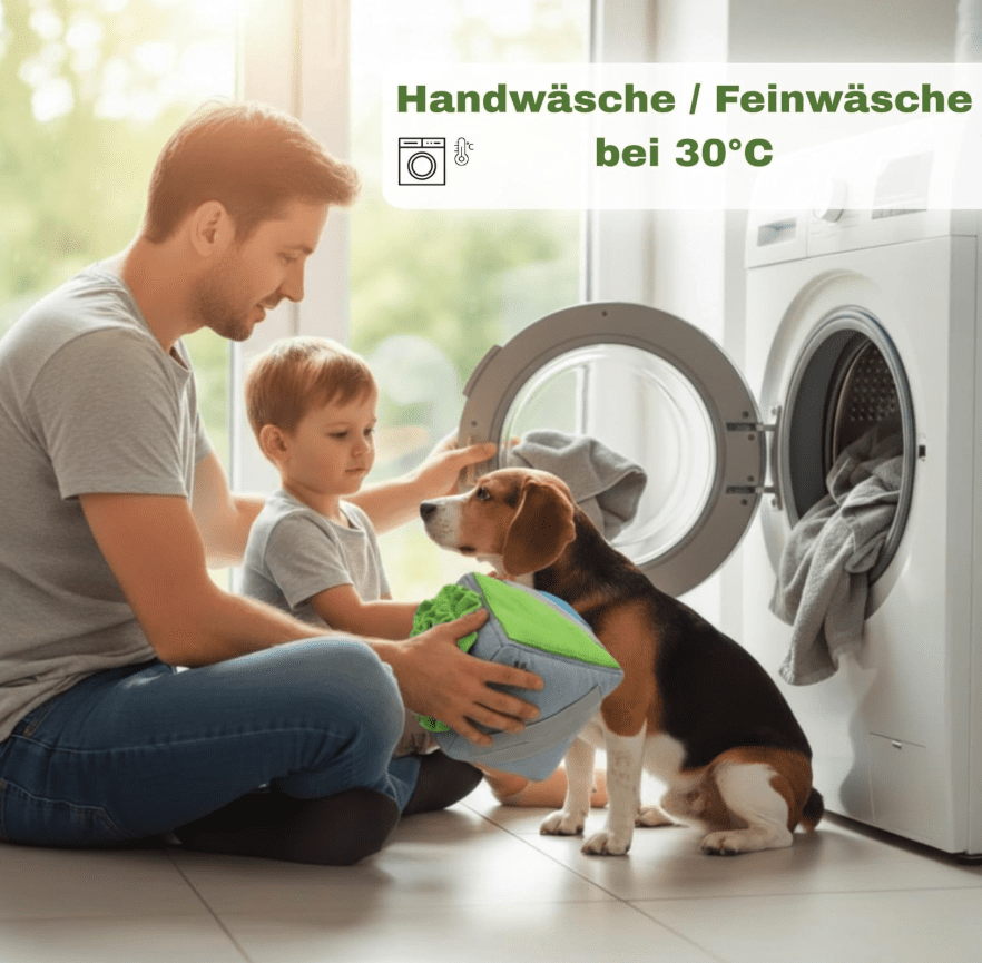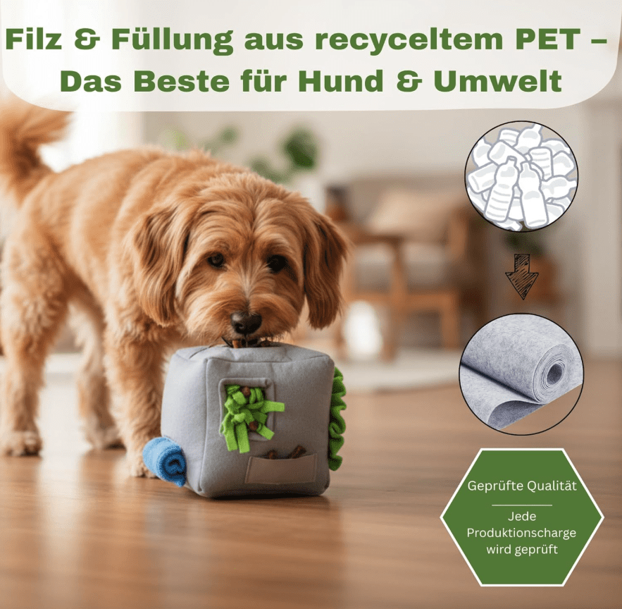 Zweitens überzeugt der Sniffix® Würfel durch sein nachhaltiges Premium-Material. Er besteht aus recyceltem rPET, worunter sowohl der Filz als auch die Füllung fallen. Dieses Material ist geruchsneutral und kommt ganz ohne unangenehmen Chemiegeruch aus. Damit ist es um Längen nachhaltiger als die Materialien herkömmlicher Kunststoff-Intelligenzspielzeuge. Diese Eigenschaft dürfte vor allem umweltbewusste Hundebesitzer ansprechen, die nach einem funktionalen Spielzeug suchen, das nicht auf Kosten der Umwelt geht.