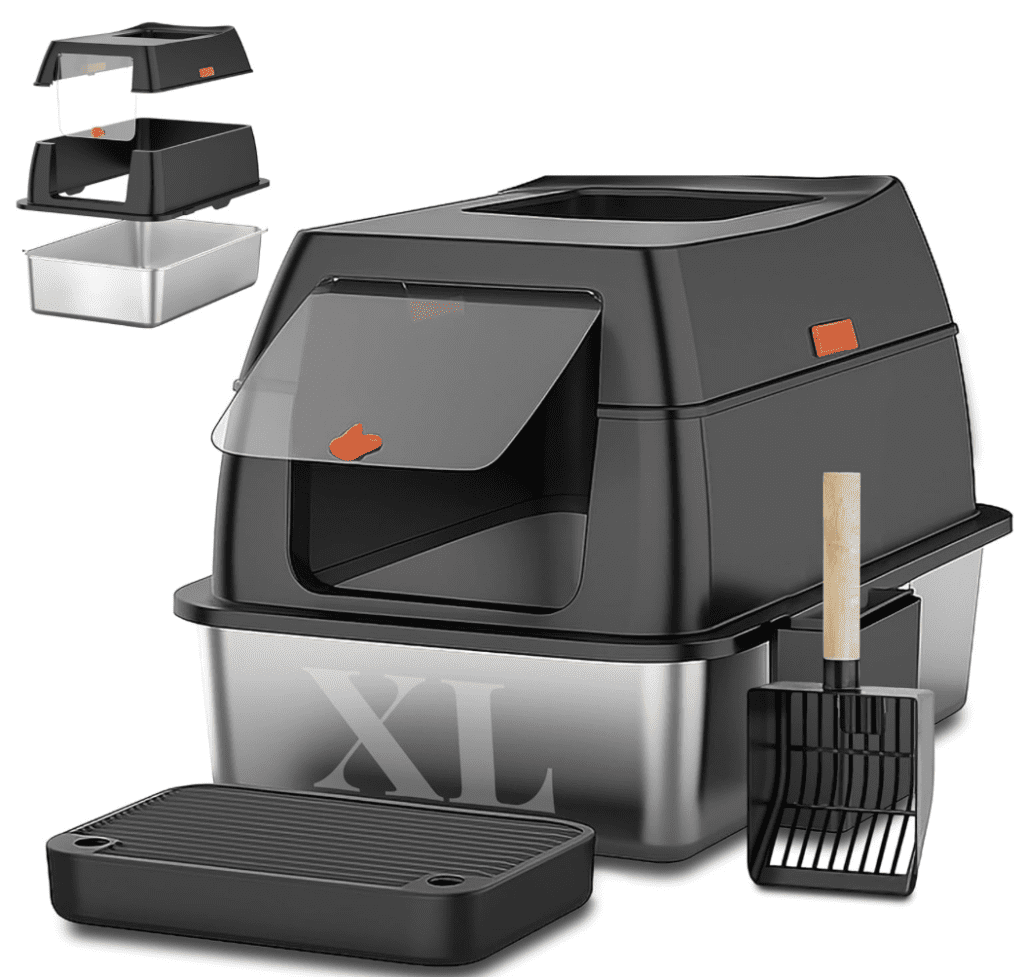 Zum Lieferumfang gehört neben dem Edelstahl-Katzenklo mit abnehmbarem Deckel auch eine Fronttür, die sich je nach den Bedürfnissen der Katze abnehmen oder sperren lässt.