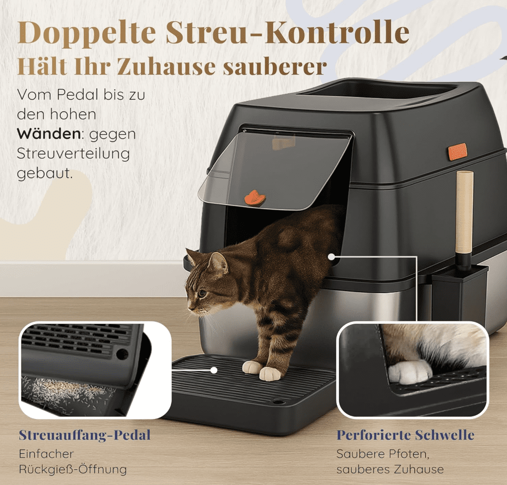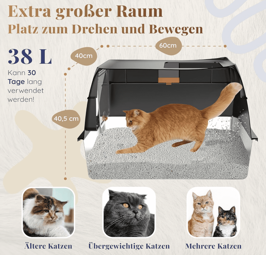 Ein weiterer Vorteil dieser Katzentoilette ist ihre platzsparende Konstruktion. Sie eignet sich ideal auch für kleine Räume, da der Ein- und Ausstieg der Katze flexibel angepasst werden kann. Dieses Design erlaubt eine vielseitige Platzierung des Katzenklos.