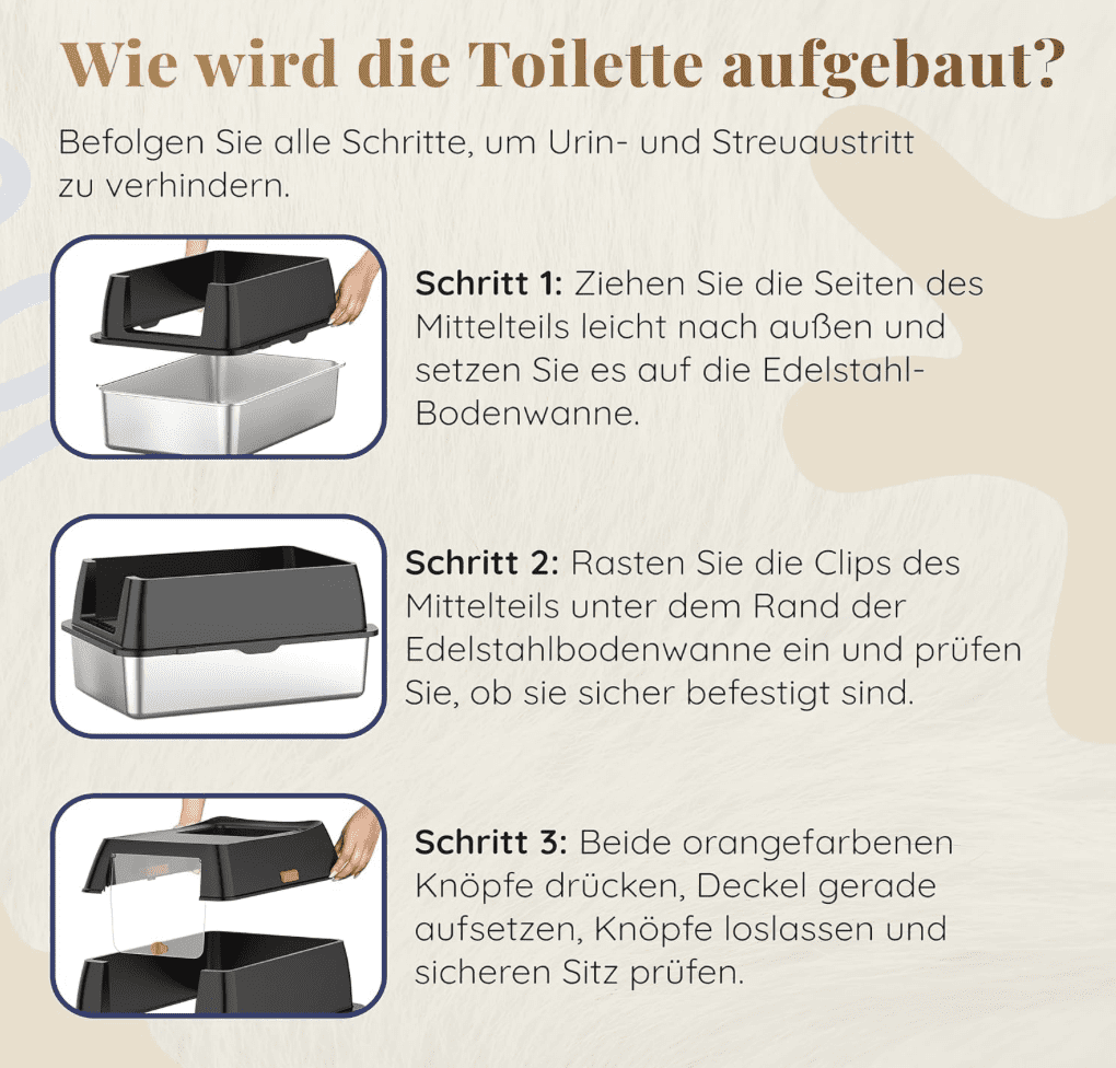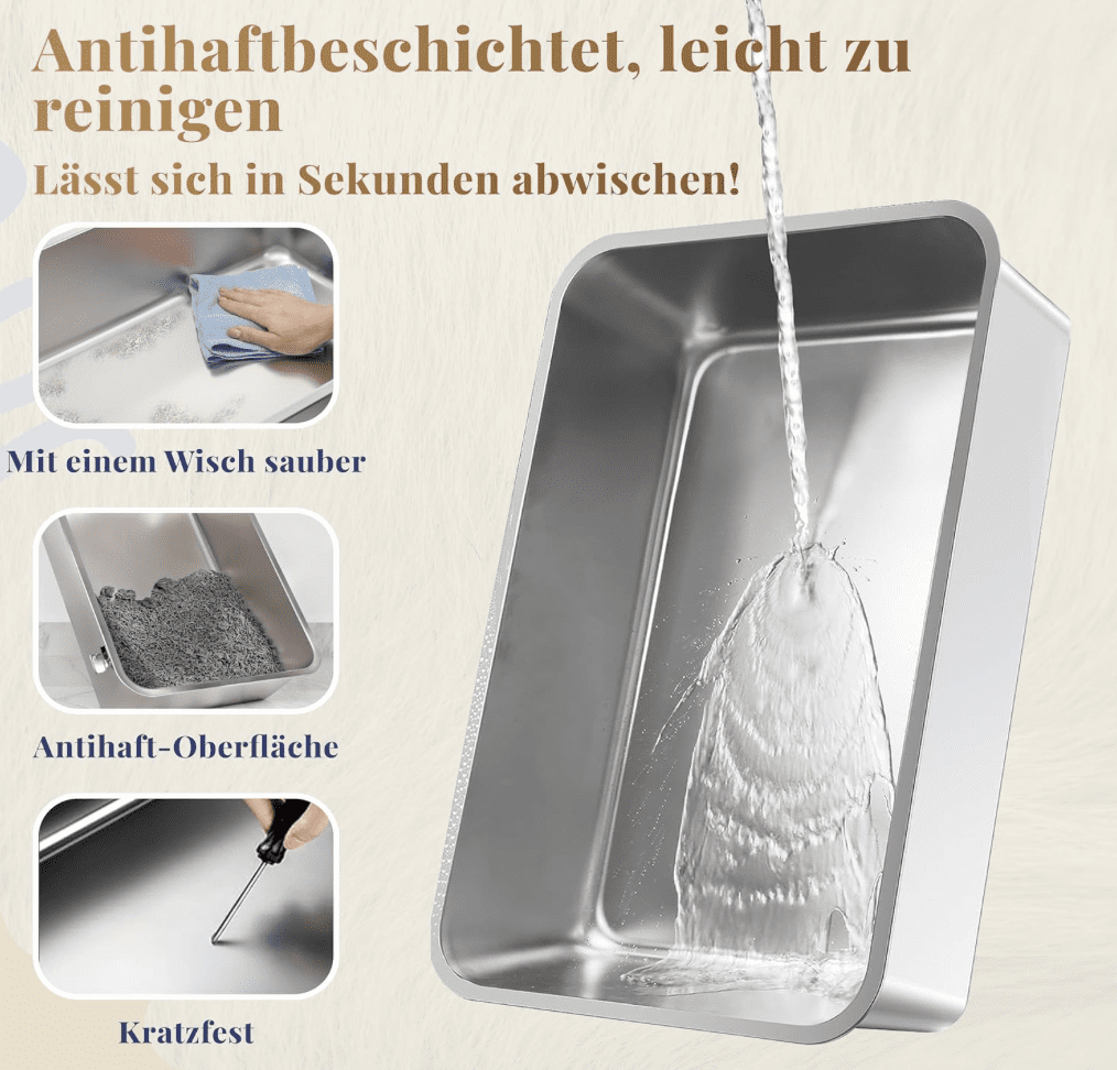 Einfache und regelmäßige Pflege ist ein weiterer Pluspunkt dieser Katzen-Toilette. Die Edelstahlwanne lässt sich mit einem Lappen leicht auswischen oder ausspülen. Wir haben festgestellt, dass nichts daran haften bleibt und keine unangenehmen Gerüche zurückbleiben.