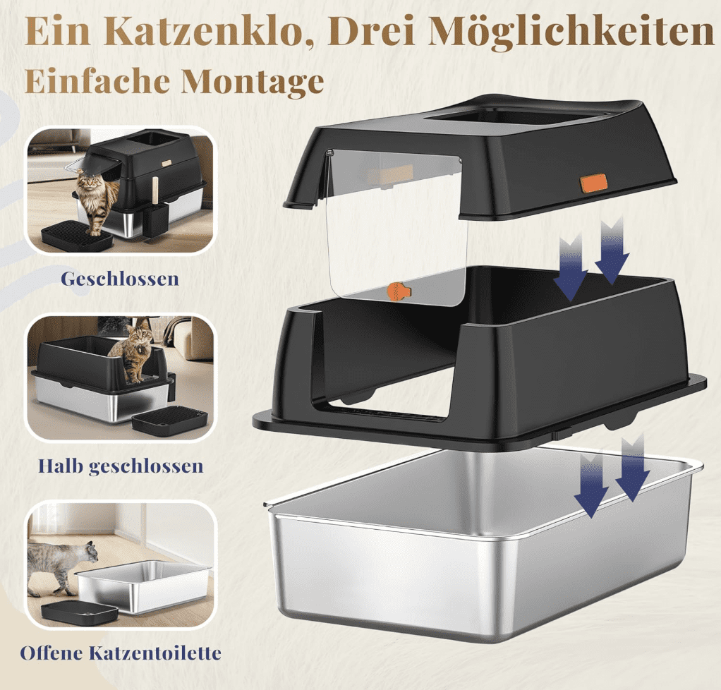 Innovativ an dieser Katzentoilette sind die zwei Ein- und Ausgänge, die den Vierbeinern genügend Raum und Komfort für ihre Bedürfnisse bieten. Darüber hinaus punktet das Produkt mit einem einzigartigen 3-in-1-System. Mit diesem Feature kann die Toilette je nach Vorlieben des Haustieres und den Anforderungen der Besitzer offen, halb-offen oder geschlossen genutzt werden.