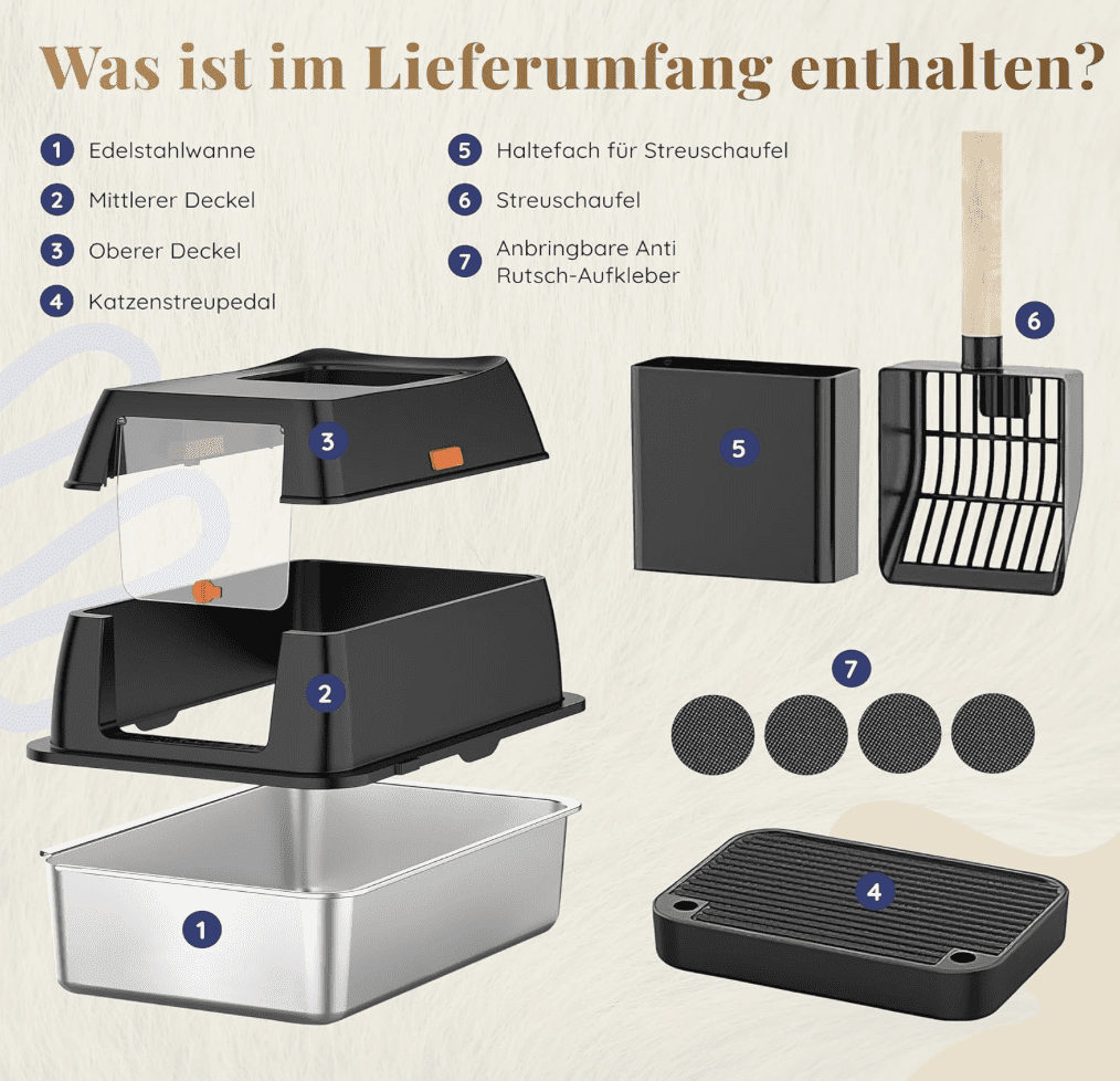 Daneben ist auch eine hochwertige Streuschaufel inklusive nützlicher Halterung enthalten, die die Reinigung des Katzenklos erleichtert.