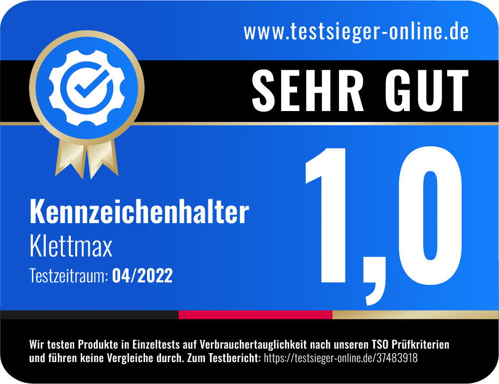 Bei unseren Tests konnten wir feststellen, dass die Kennzeichenhalterung, wie vom Hersteller beschrieben, einwandfrei funktioniert. Wir geben dafür volle Punktzahl. Das Produkt ist sicher verpackt und gelangt mit schnellen Lieferzeiten zu Ihnen nach Hause. Besonders auffällig ist die hochwertige Produktverpackung. Des Weiteren wurden Punkte abgezogen für das Fehlen der Angabe des Herstellerlandes. Insgesamt erhält Klettmax® in unserem Vergleich und Produkttest 100 Punkte. Herzlichen Glückwunsch – Eine klare Kaufempfehlung.
