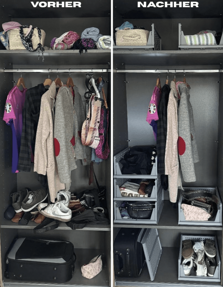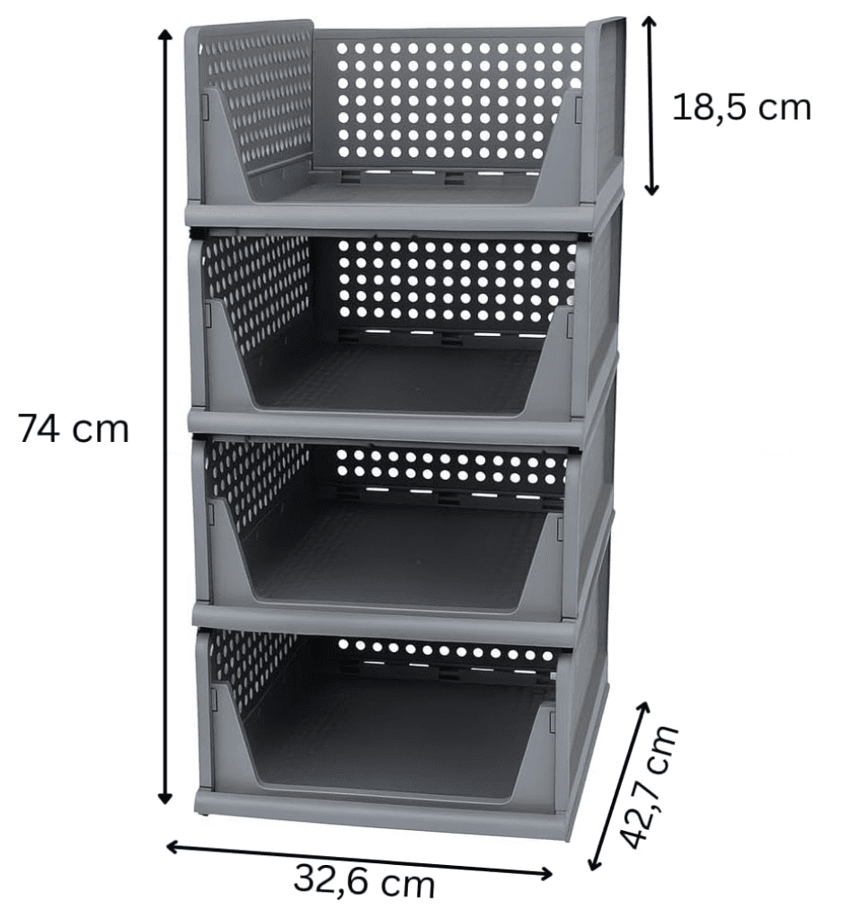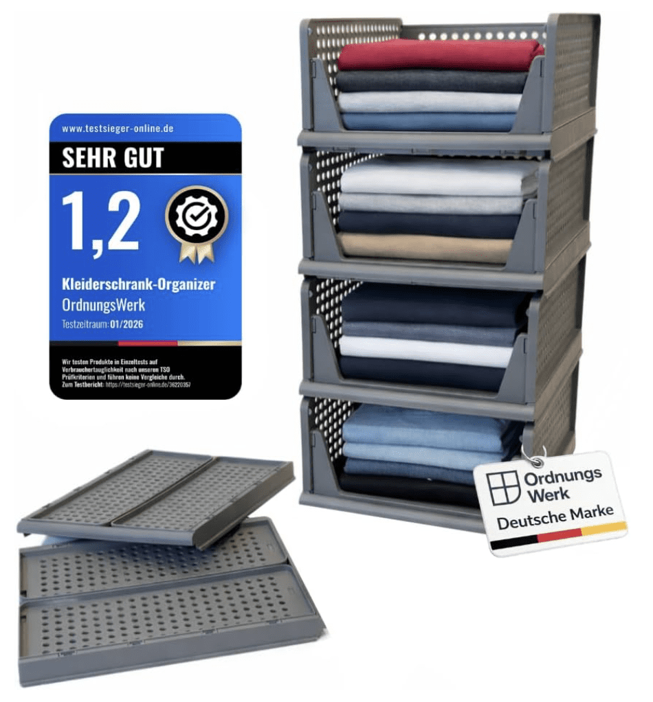 Durch die stapelbaren Fächer entsteht sofort mehr Platz und Übersicht, da ein ungeordneter Schrank in ein klar strukturiertes System verwandelt wird – ganz ohne zusätzlichen Stauraum. Die offene, schubladenartige Front ermöglicht es, einzelne Kleidungsstücke herauszunehmen, ohne den restlichen Stapel zu verschieben oder Unordnung zu verursachen. Dadurch lassen sich Dinge schneller finden und ebenso leicht wieder einräumen, was den Alltag spürbar erleichtert.