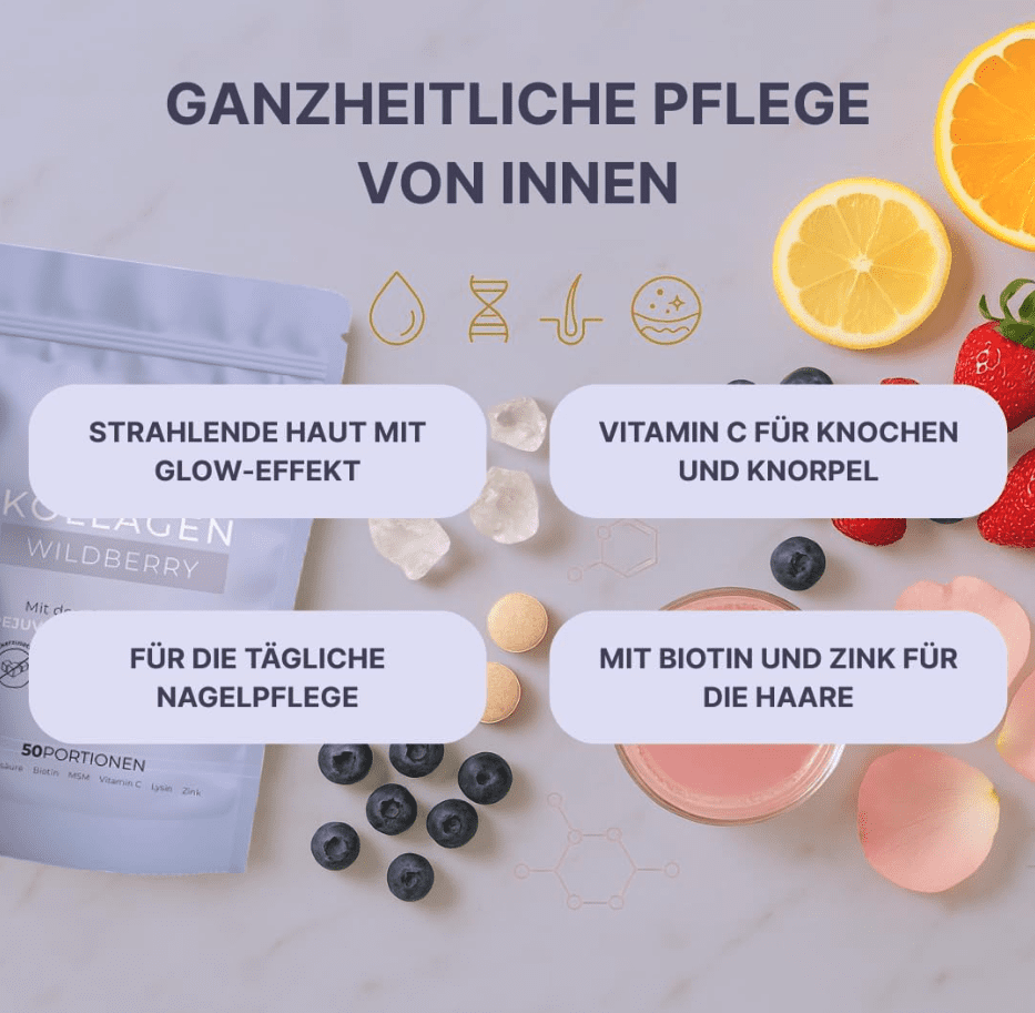 Die Wirkung des Kollagenpulvers kann durch die Kombination mit Vitamin C verstärkt werden, welches bereits im Produkt enthalten ist. Um die Vitamin C Aufnahme zu unterstützen, können zusätzlich frische Zitrusfrüchte oder Orangensaft hinzugefügt werden. Vitamin C trägt wesentlich zur körpereigenen Kollagenbildung bei.
