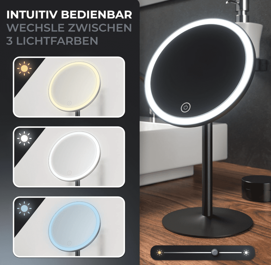 Erstens, die Möglichkeit des Farbwechsels und die Dimmfunktion. Über eine einfach zu bedienende Touch-Oberfläche lässt sich das Licht des Skorpa Schminkspiegels an Ihre individuellen Bedürfnisse anpassen. Sie können also das Licht dimmen oder umstellen, ganz nach dem, was Sie gerade benötigen.