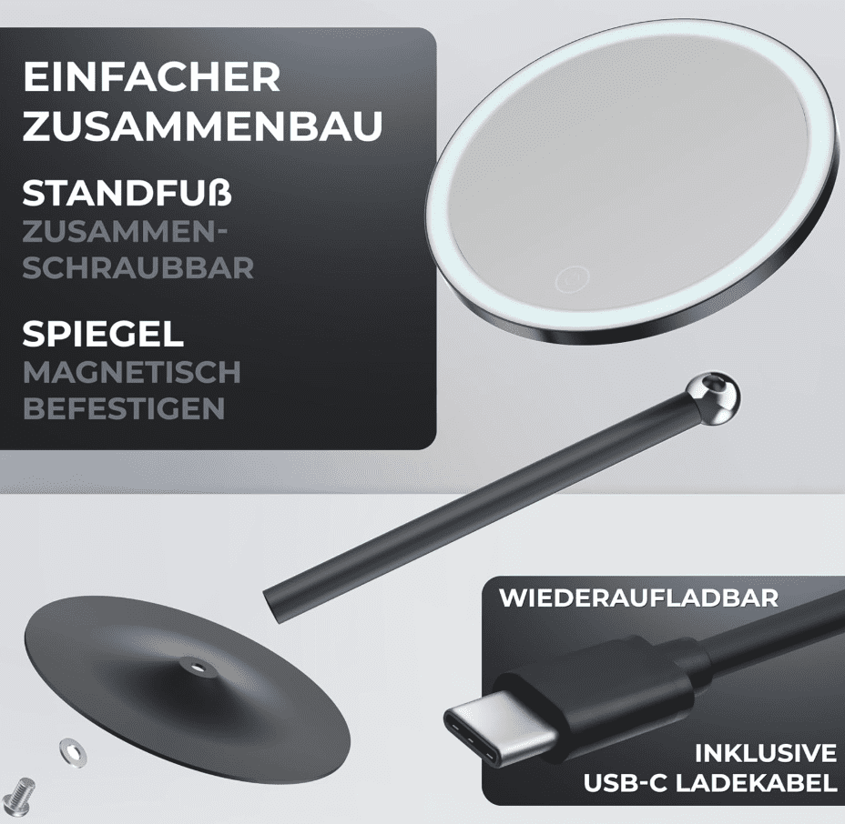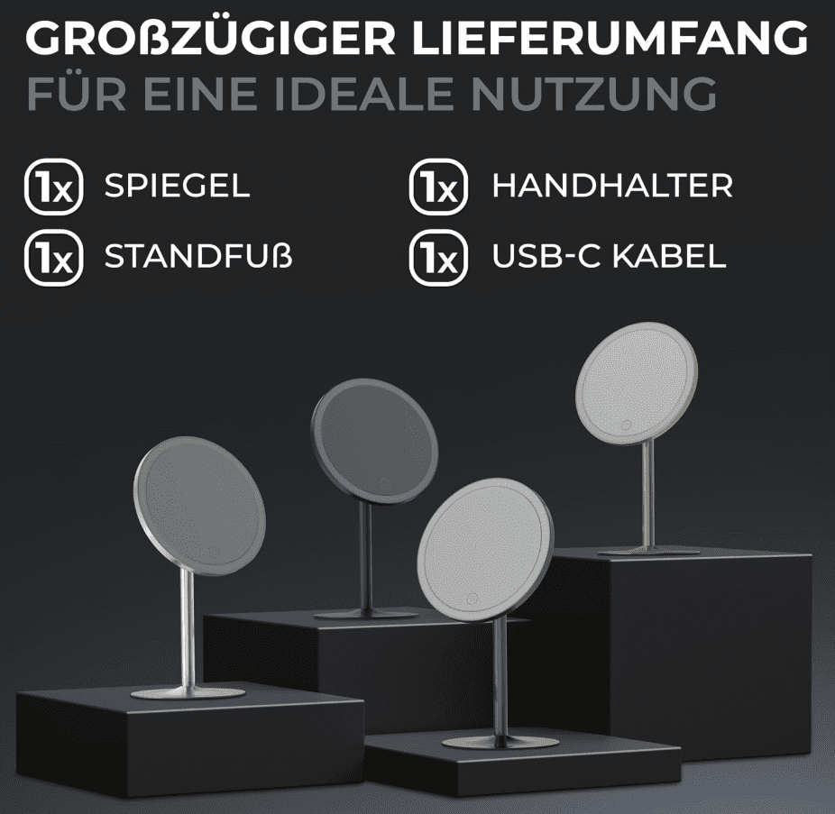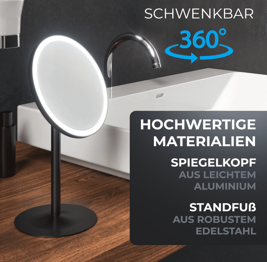 Drittens und letztens, seine hochwertige und mobile Beschaffenheit. Der freistehende Spiegel sowie der Standfuß sind aus robustem Edelstahl gefertigt, was eine lange Lebensdauer garantiert. Sie können den spiegellosen Kosmetikspiegel überall nutzen, sei es im Bad, Schlafzimmer oder sogar auf dem Esstisch.