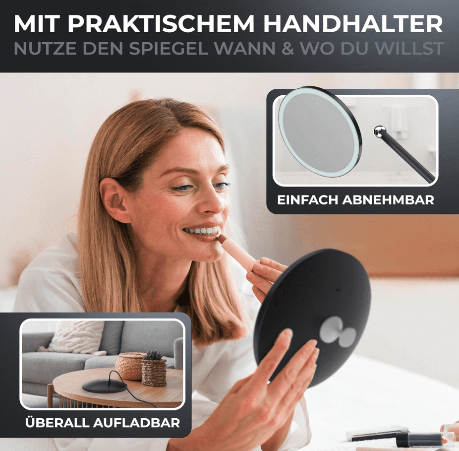 Kunden erhalten mit dem Produkt nicht nur einen flexiblen Spiegel, sondern auch praktische Anwendungstipps: Der Spiegelkopf ist abnehmbar, sodass er sich überallhin in der Wohnung mitnehmen lässt. Zusätzlich wird ein Handhalter mitgeliefert, der die Nutzung besonders komfortabel macht und zugleich das Aufladen des Spiegelkopfes erleichtert. So können Anwender den Spiegel flexibel einsetzen und jederzeit optimal ausrichten.