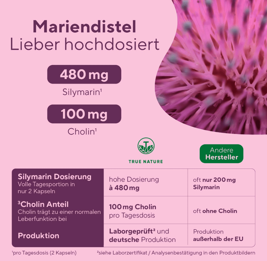 Der TRUE NATURE Leber Komplex zeichnet sich vor allem durch seine drei wichtigsten Eigenschaften aus, die für Kunden besonders relevant sind. Erstens enthält dieses Produkt einen hochdosierten Silymarin-Gehalt von 480 mg pro Tagesdosis. Im Vergleich zu vielen anderen auf dem Markt erhältlichen Produkten bietet der Leber Komplex damit eine deutlich höhere Menge an Silymarin pro Tagesdosis. Dies ermöglicht eine konzentriertere Aufnahme der in der Mariendistel enthaltenen Pflanzenstoffe und sorgt für eine gesteigerte Effektivität des Produkts.