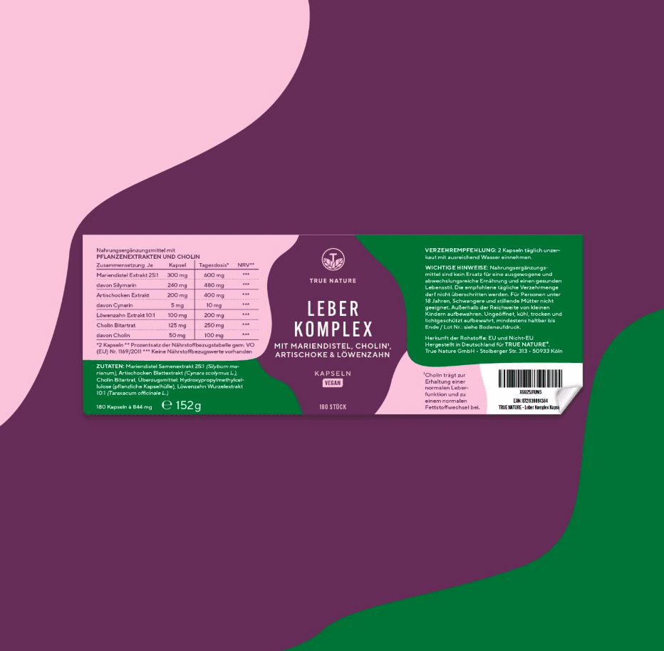 Zweitens enthält der TRUE NATURE Leber Komplex 100 mg Cholin pro Tagesdosis. Cholin trägt maßgeblich zu einer normalen Leberfunktion bei und ist in vielen vergleichbaren Produkten nicht enthalten oder nur in geringeren Mengen vorhanden. Die Kombination aus Mariendistel, Artischocke und Löwenzahn im Leber Komplex stellt einen sinnvollen Synergie-Effekt dar und fördert die Effektivität des Produkts.