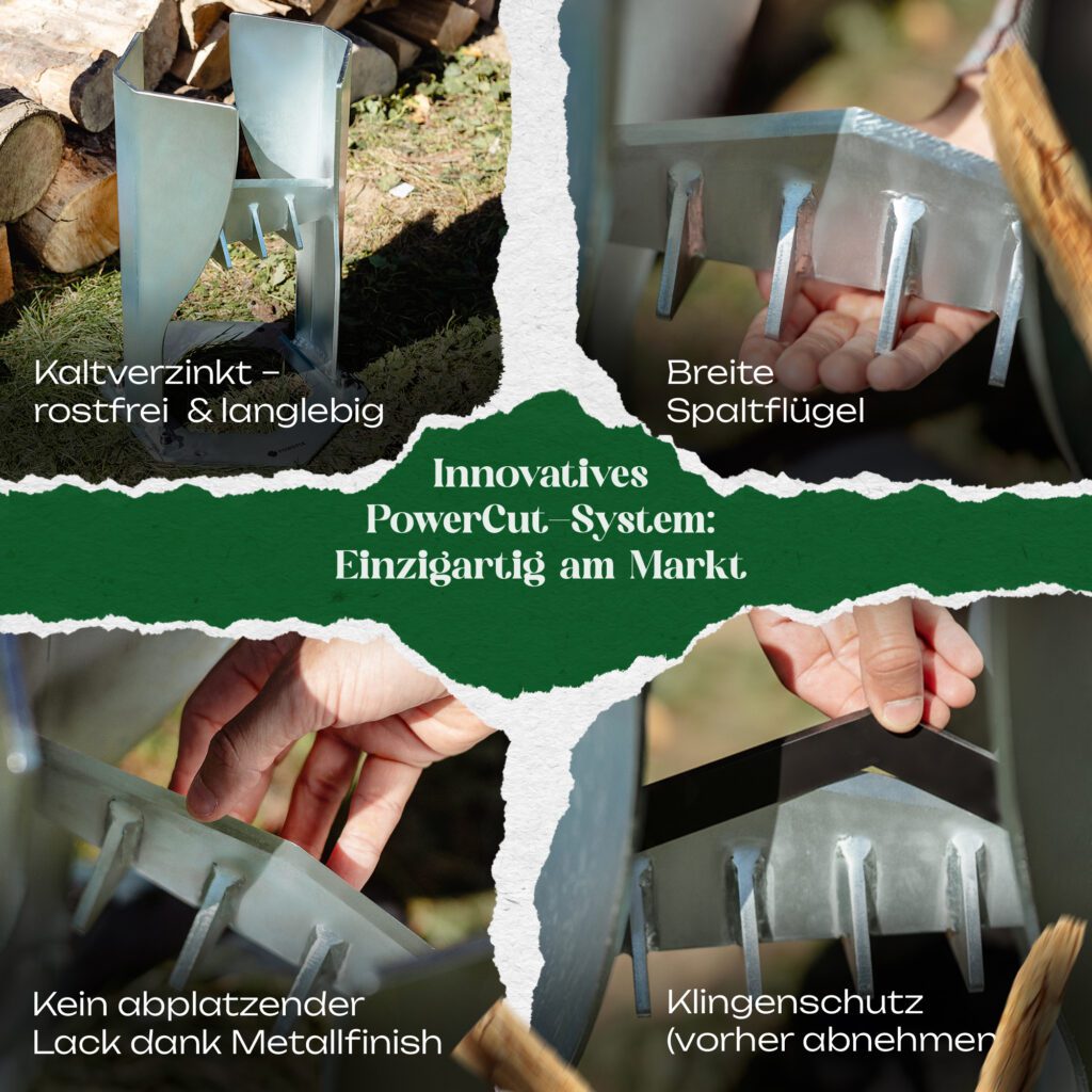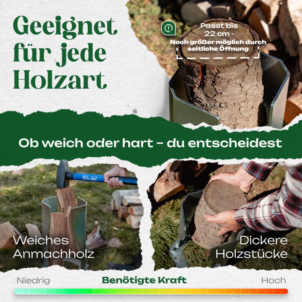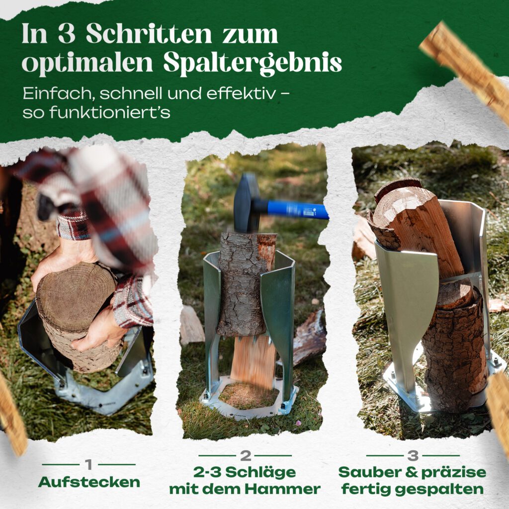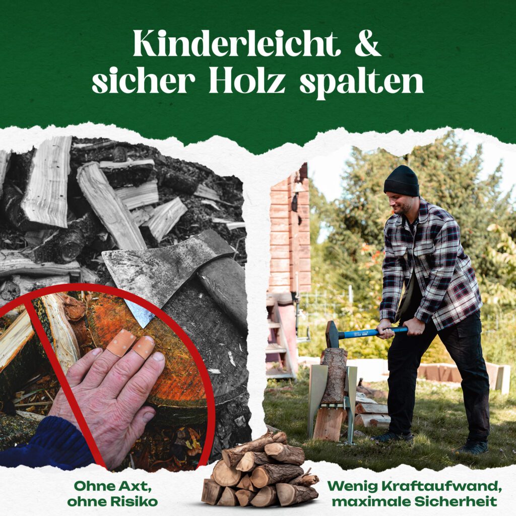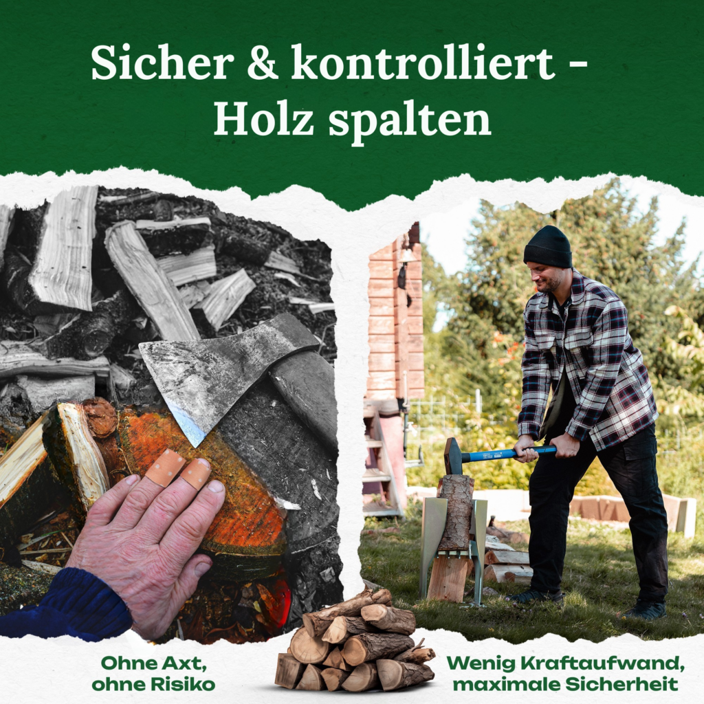 Hinweis zur Erwartungshaltung: Der PowerSplit XL reduziert nicht automatisch die körperliche Belastung. Er ermöglicht vielmehr kontrollierteres und sichereres Arbeiten als mit einer Axt – mit besserer Trefferquote und weniger Risiko durch Fehlkontakte.
