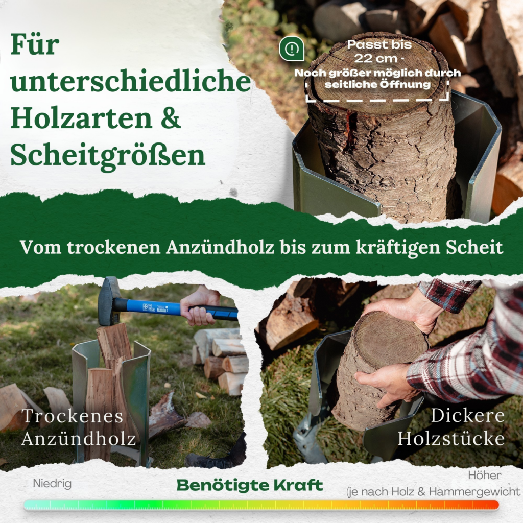 | Seitenteile führen sicher; kein Metallkontakt bei offener Seite zum Bedienenden | Sehr hartes/feuchtes Holz erfordert deutlich mehr Hammergewicht/Kraft |