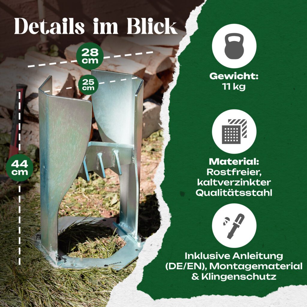 Die Zinkoberfläche schützt effektiv gegen Korrosion – ein Plus für Lagerung in Garage/Schuppen. Die Konstruktion ist auf wiederholte Hammerschläge ausgelegt; Verwindungen oder Kippeln traten im Test nicht auf, korrekt montierter Untergrund vorausgesetzt. Das Seitenteil-Design ist der praxisnahe Kern: Es zentriert den Scheit, hält ihn führbar und erweitert den nutzbaren Durchmesserbereich, weil oben mehr Luft bleibt. In der Anwendung resultiert das in weniger Korrekturschlägen und sauber aufreißenden Fasern – gerade bei leicht astigen Stücken.